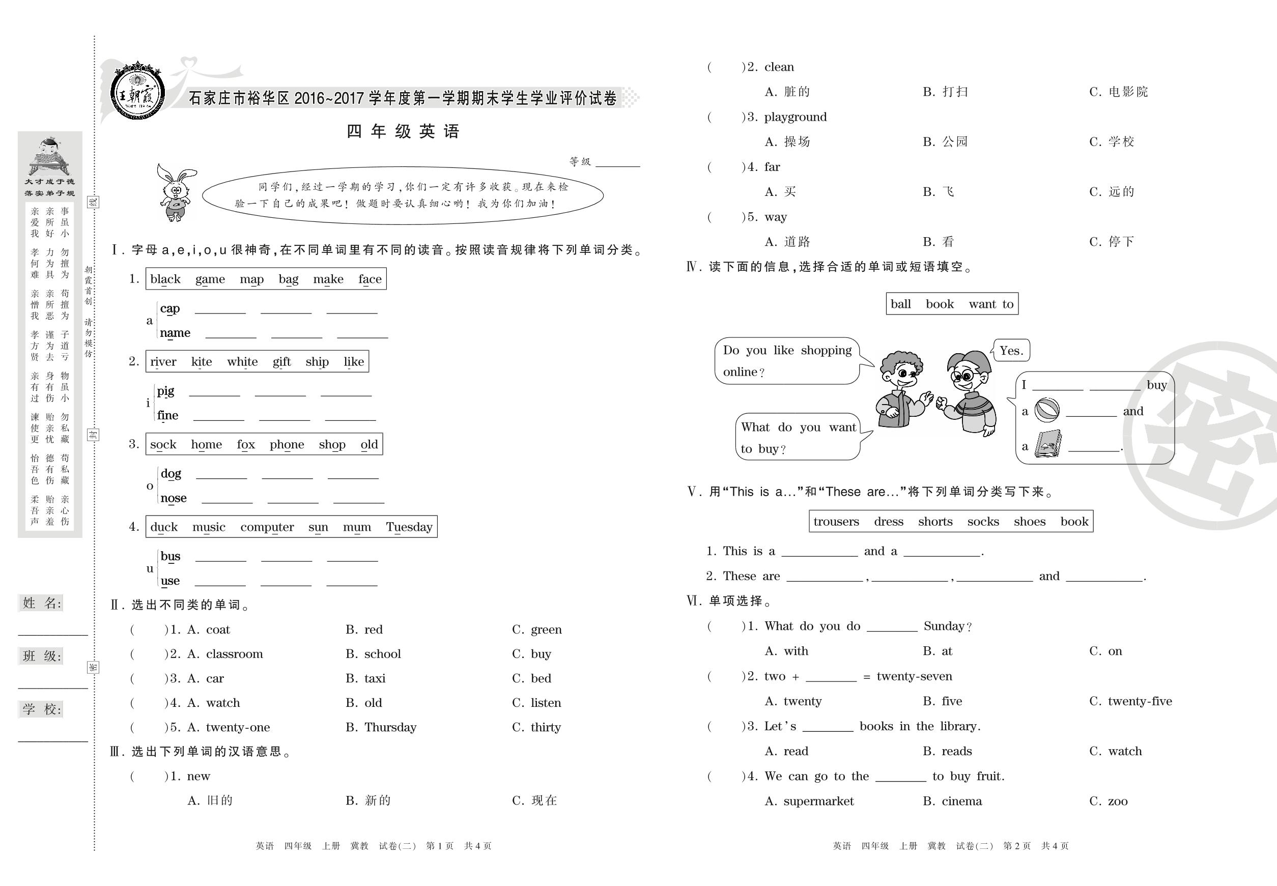 2016-2017学年第一学期石家庄市裕华区四年级英语试卷(冀教版)【2】