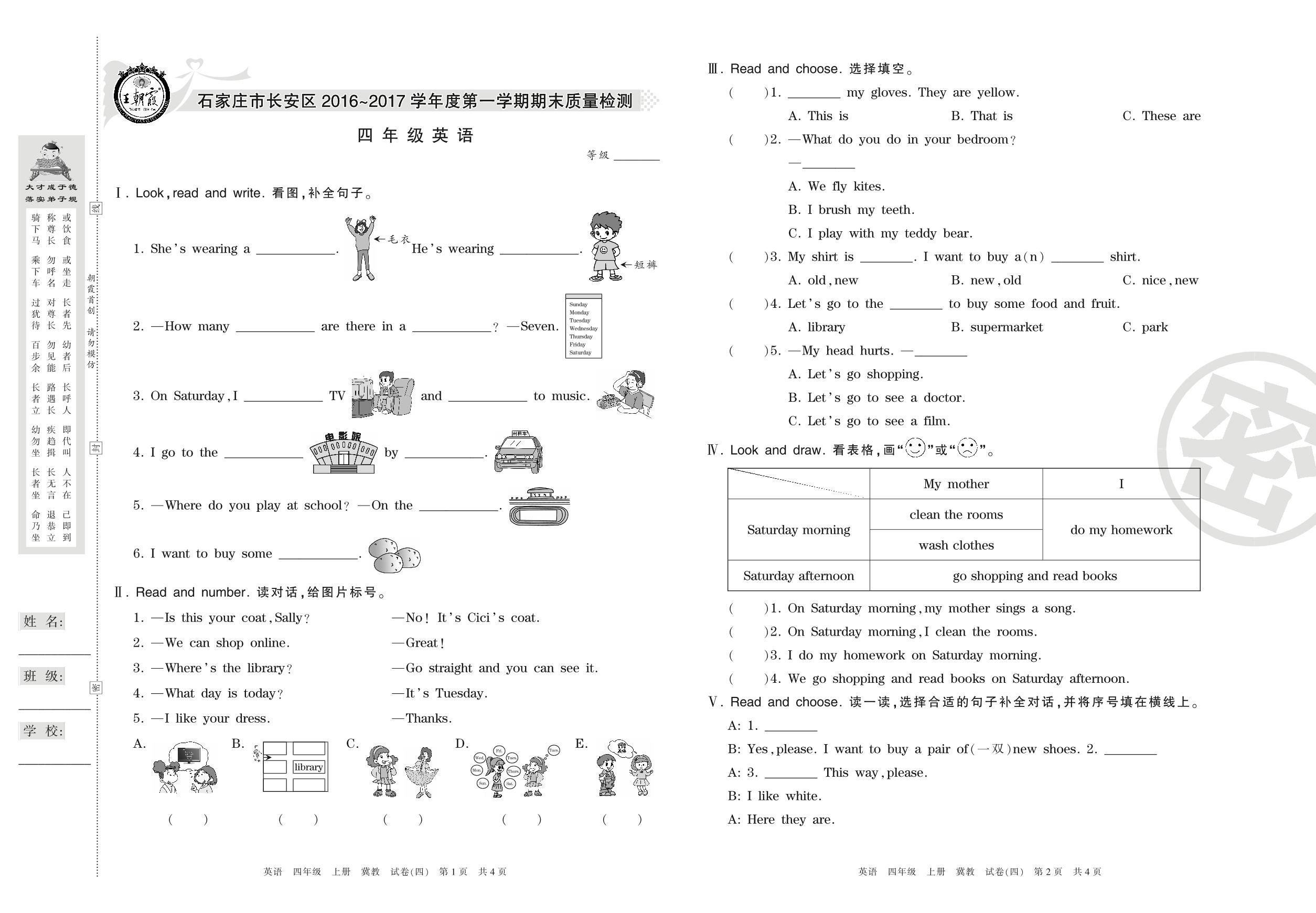 2016-2017学年第一学期石家庄市长安区四年级英语试卷(冀教版)【4】