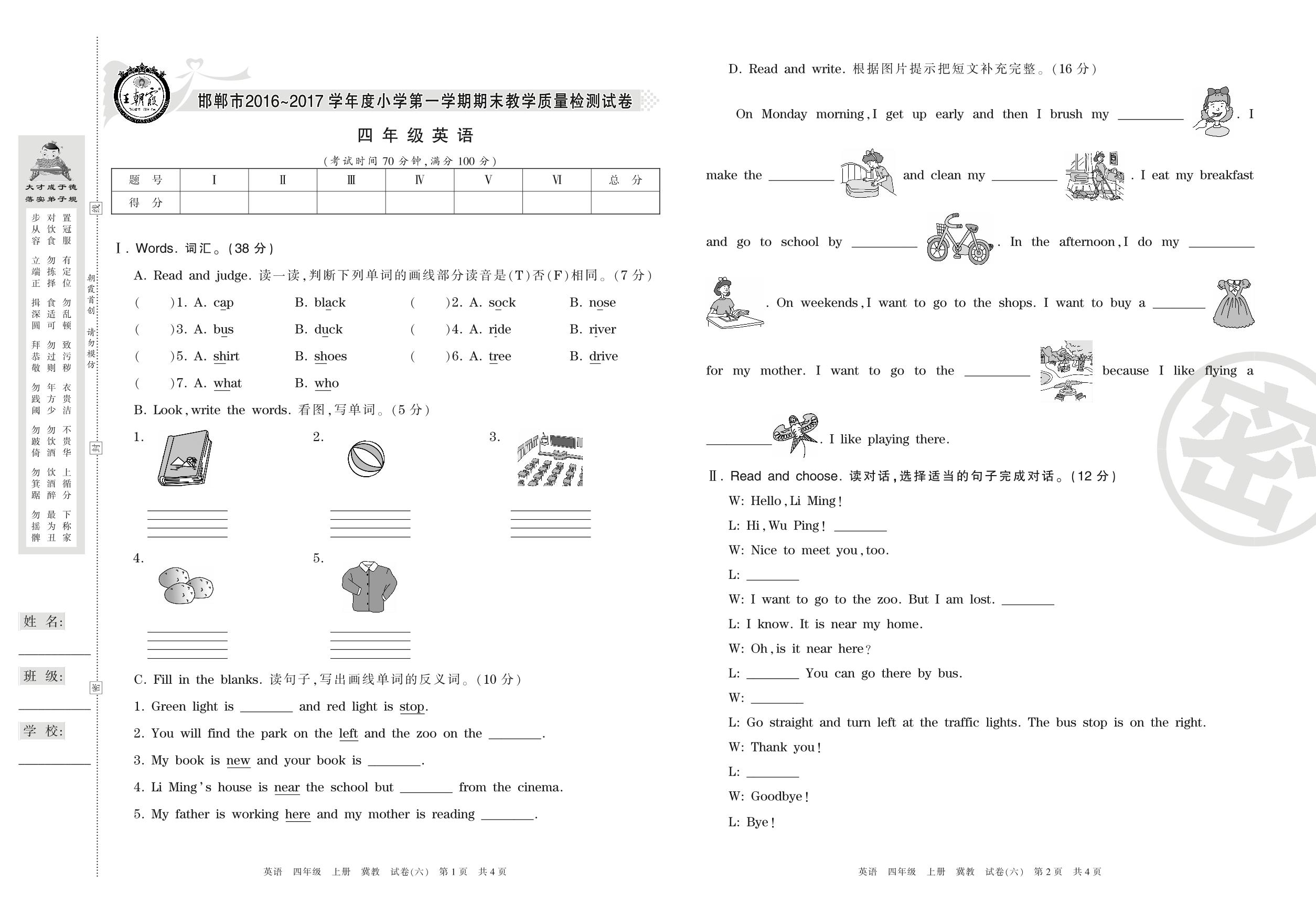 2016-2017学年第一学期邯郸市四年级英语试卷(冀教版)【6】