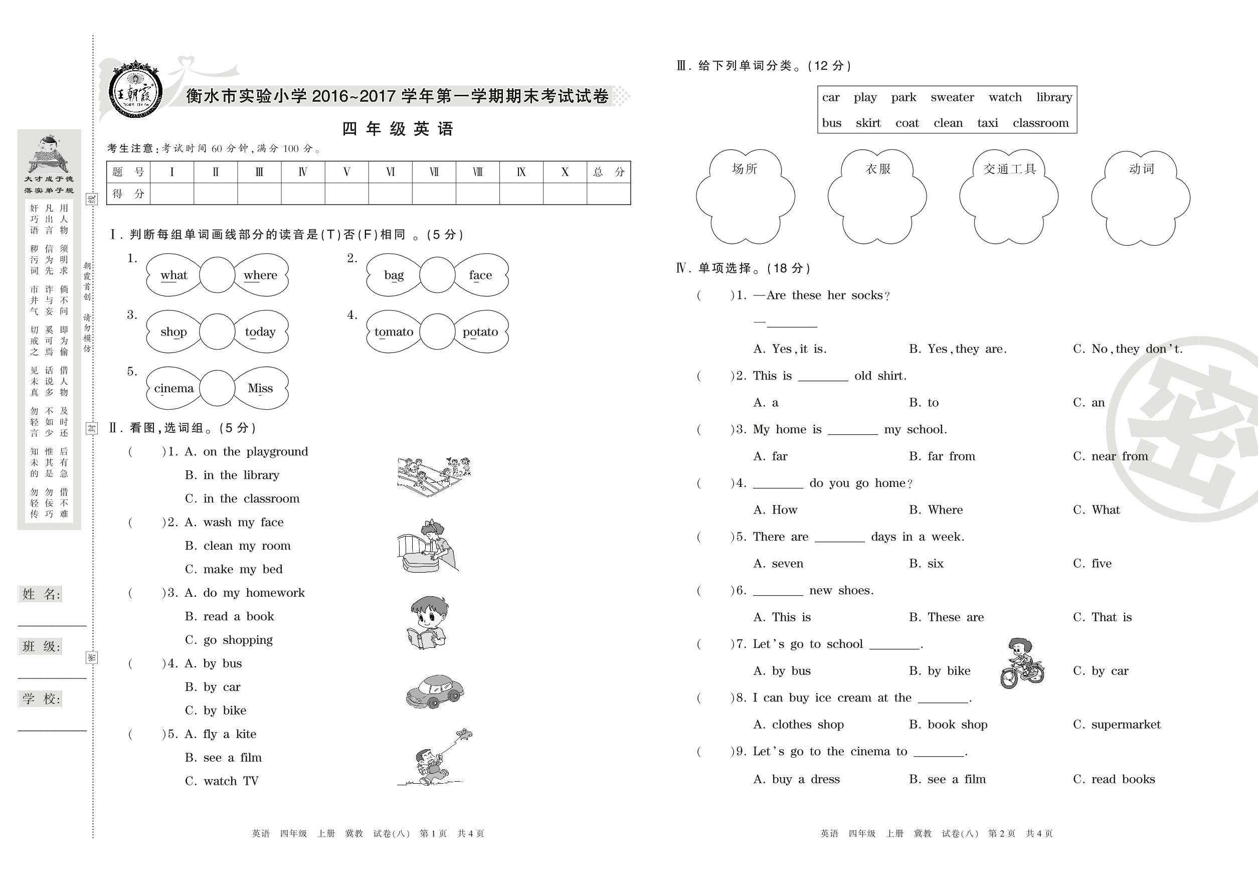 2016-2017学年第一学期衡水市四年级英语试卷(冀教版)【8】
