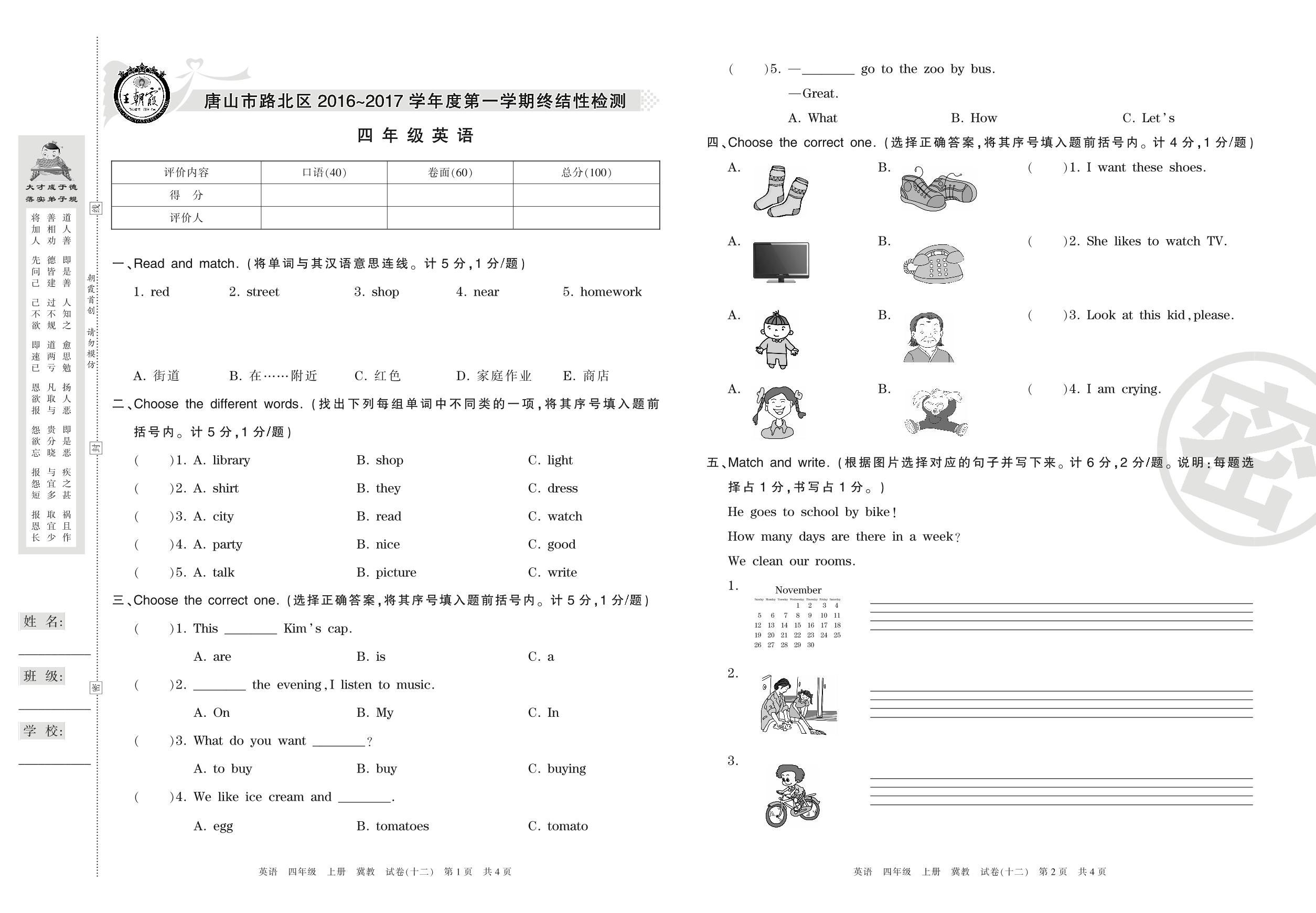 2016-2017学年第一学期唐山市路北区四年级英语试卷(冀教版)【12】