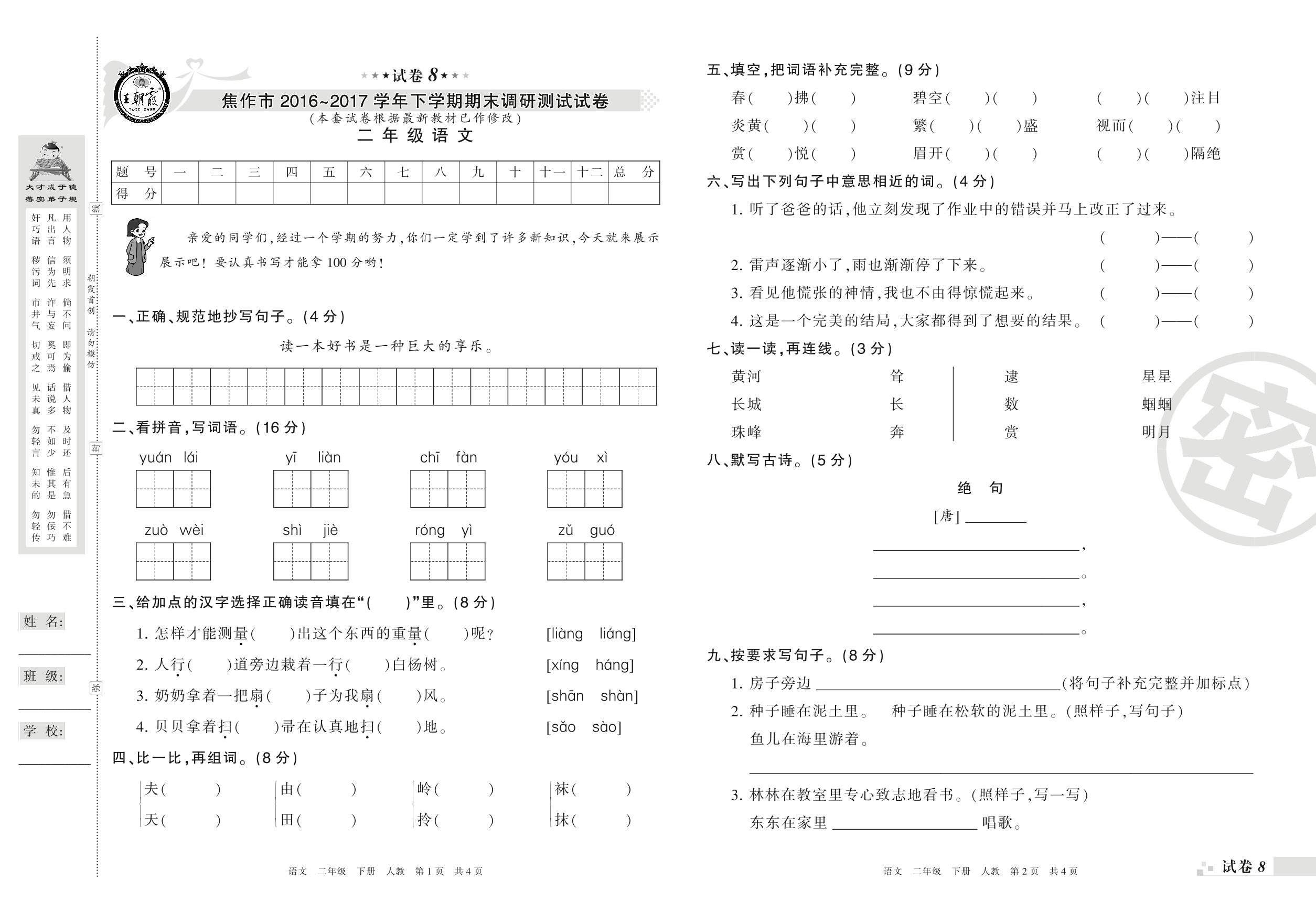 2016-2017学年第二学期焦作市二年级语文试卷(人教版)【8】