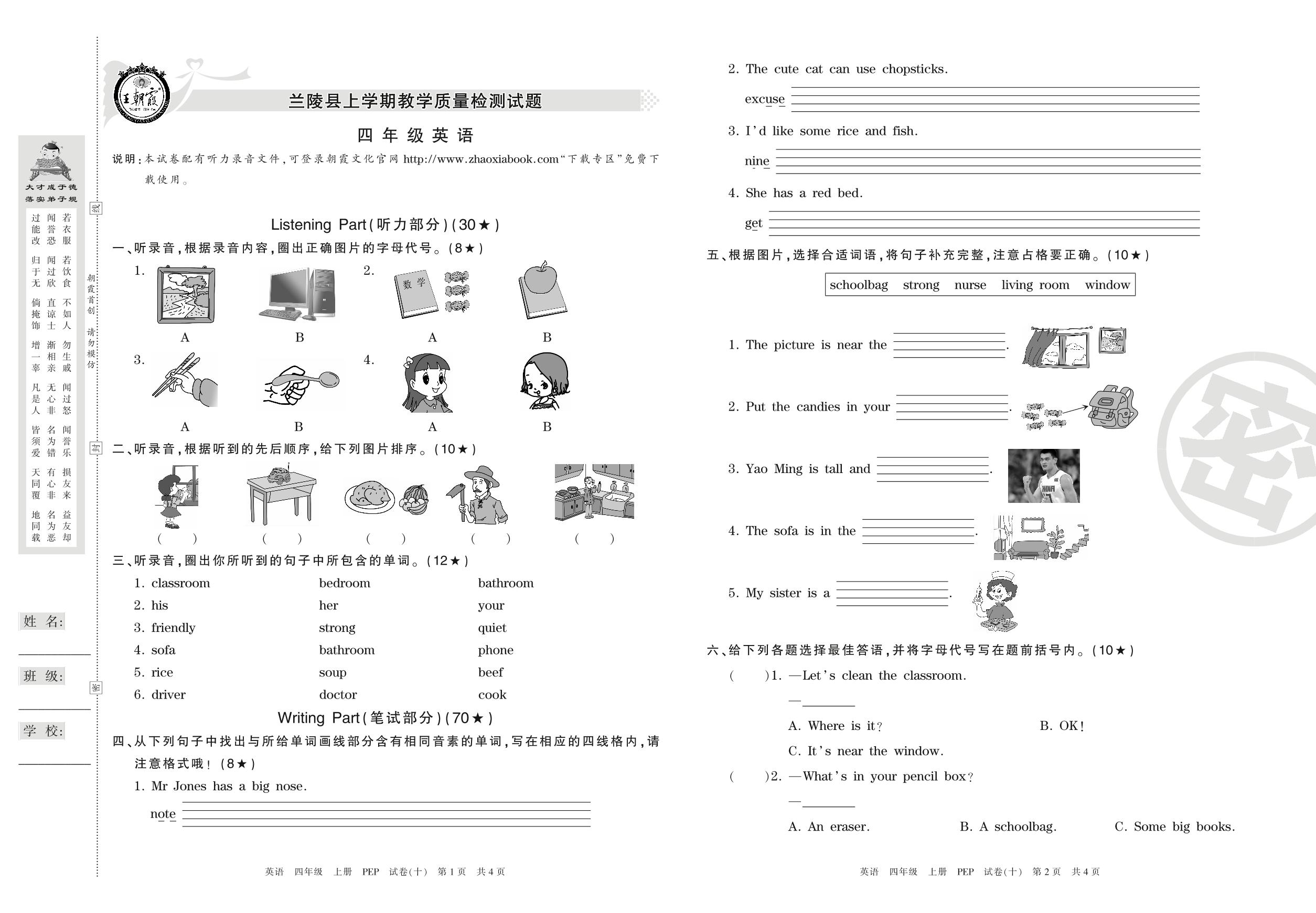 2016-2017学年第一学期临沂市兰陵县四年级英语试卷(PEP版)【10】
