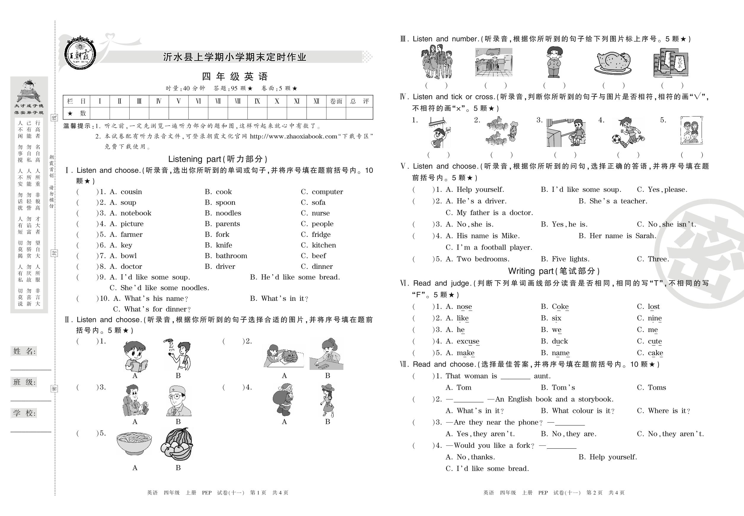 2016-2017学年第一学期临沂市沂水县四年级英语试卷(PEP版)【11】