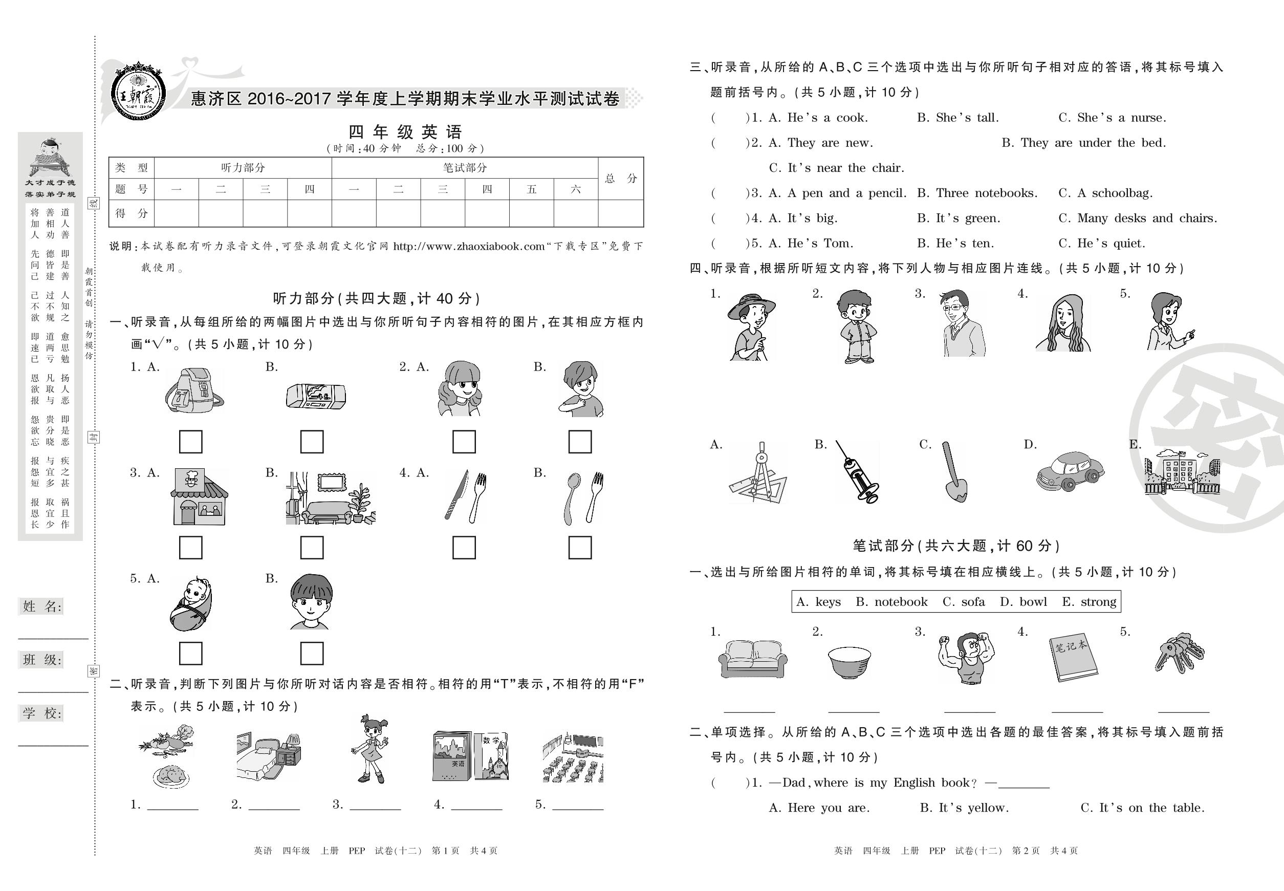 2016-2017学年第一学期郑州市惠济区四年级英语试卷(PEP版)【12】