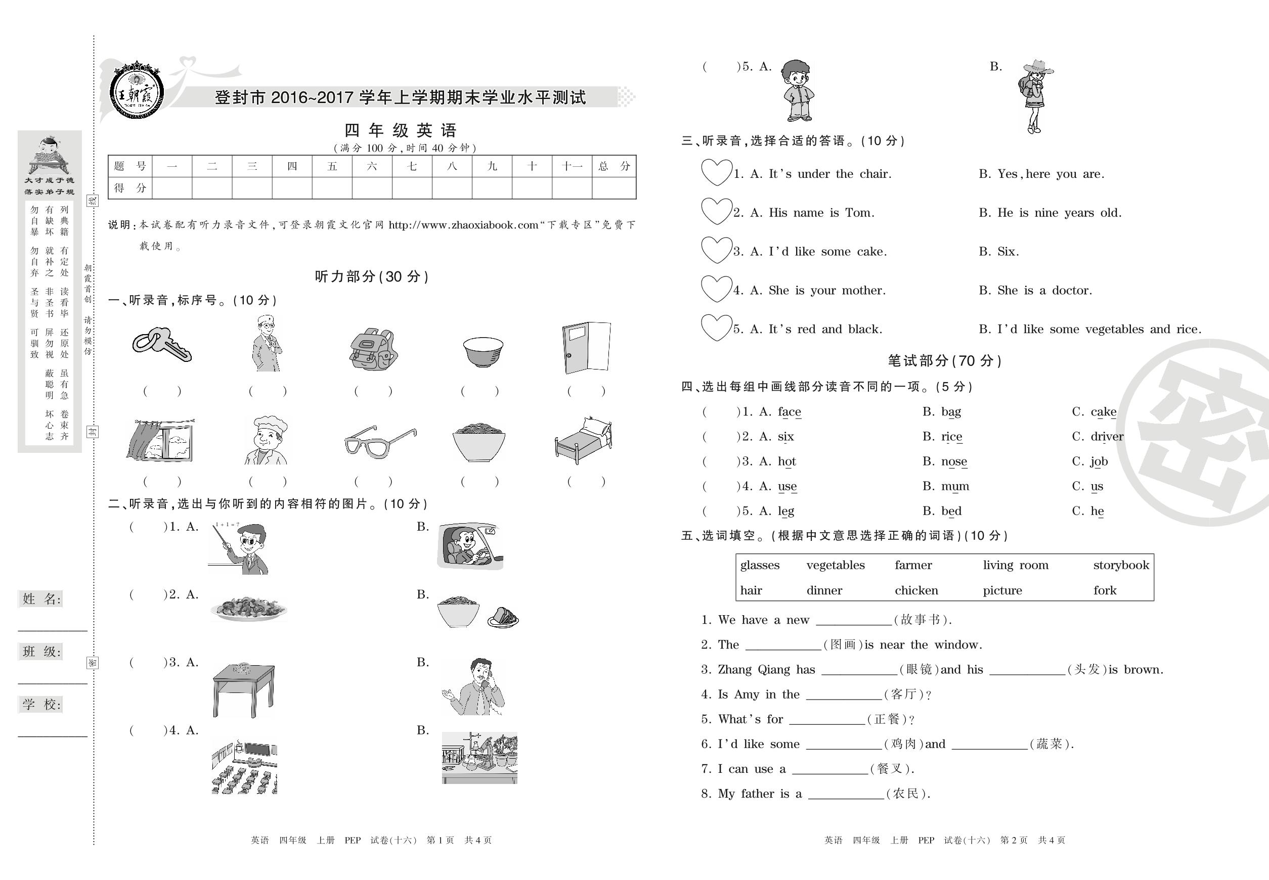 2016-2017学年第一学期登封市四年级英语试卷(PEP版)【16】