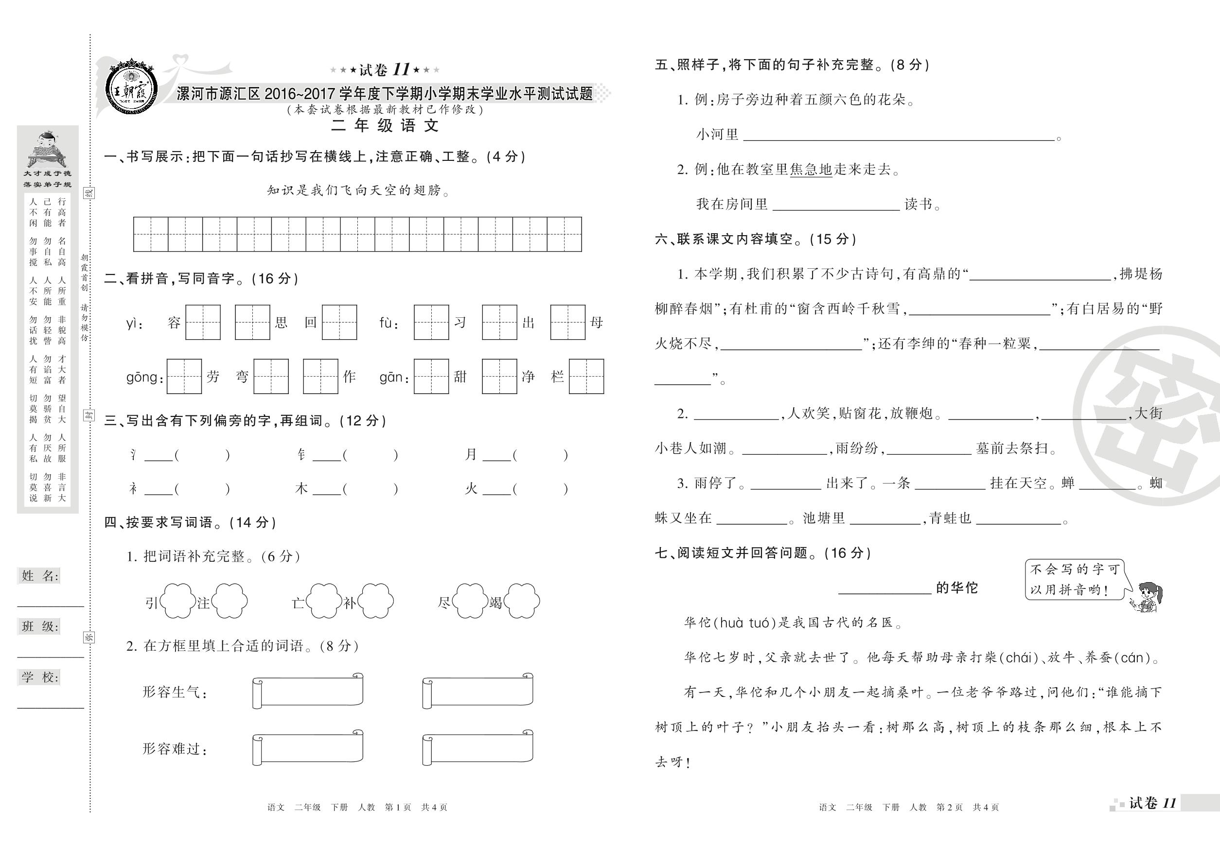 2016-2017学年第二学期漯河市源汇区二年级语文试卷(人教版)【11】