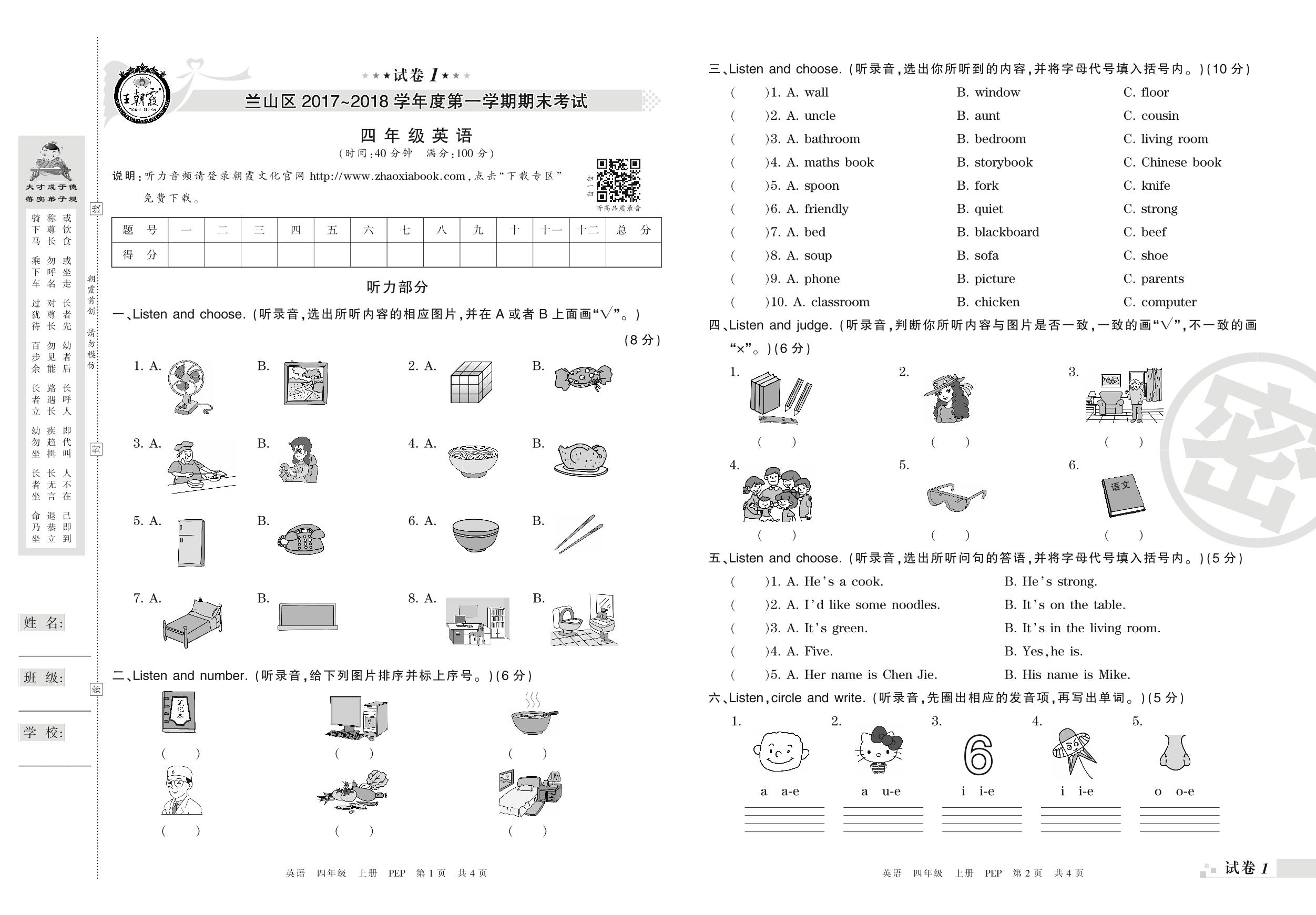 2017-2018学年第一学期临沂市兰山区四年级英语试卷(PEP版)【1】