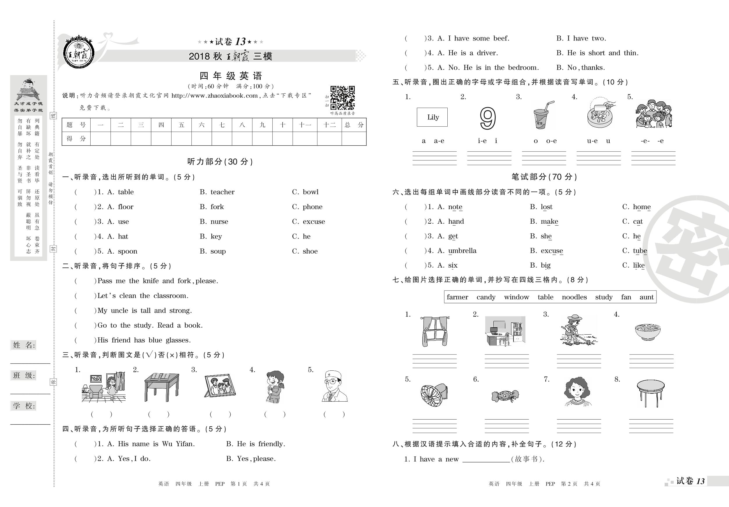 王朝霞期末模拟卷四年级上册英语(PEP版)【13】