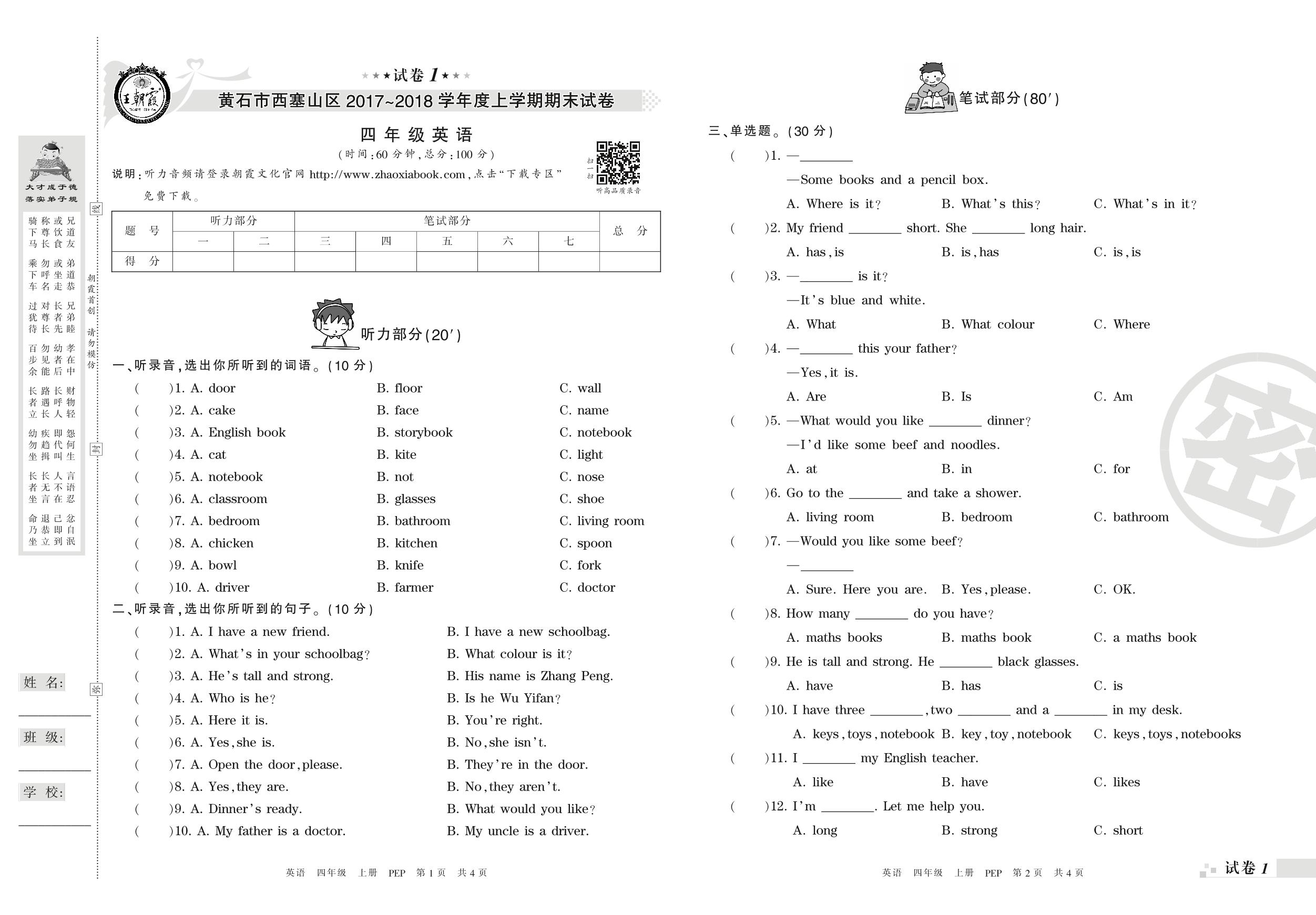 2017-2018学年第一学期黄石市西塞山区四年级英语试卷(PEP版)【1】