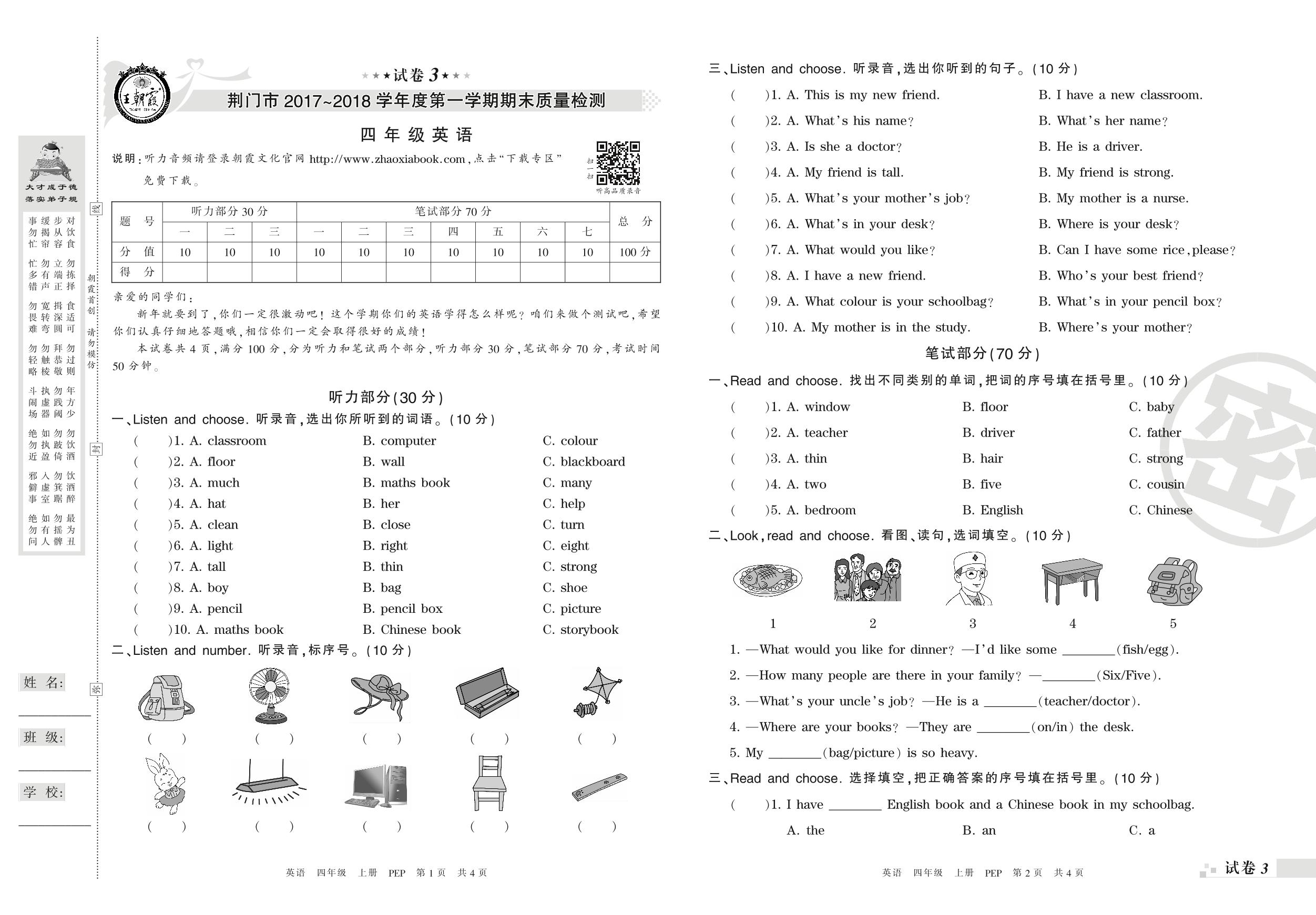 2017-2018学年第一学期荆门市四年级英语试卷(PEP版)【3】