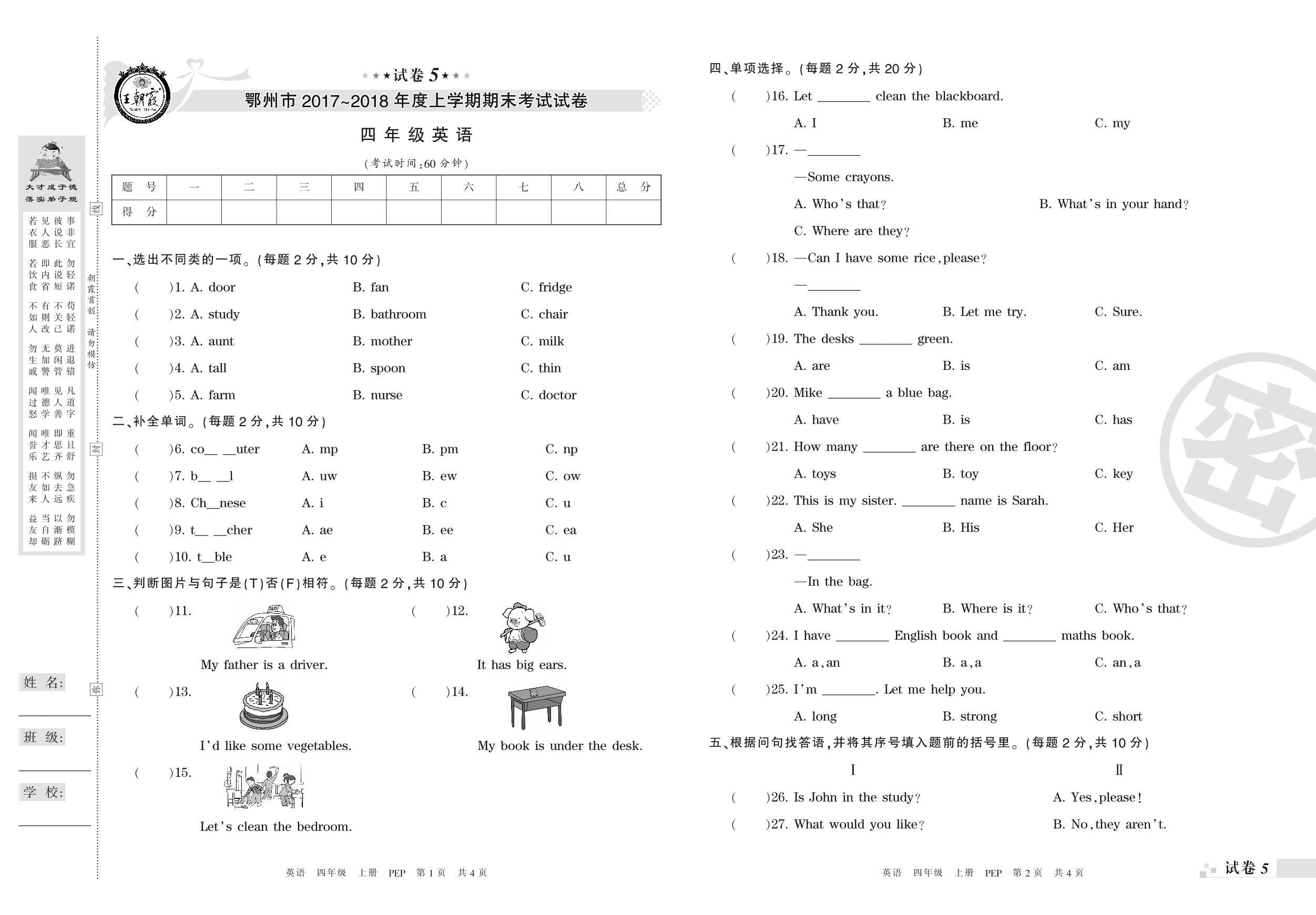 2017-2018学年第一学期鄂州市四年级英语试卷(PEP版)【5】