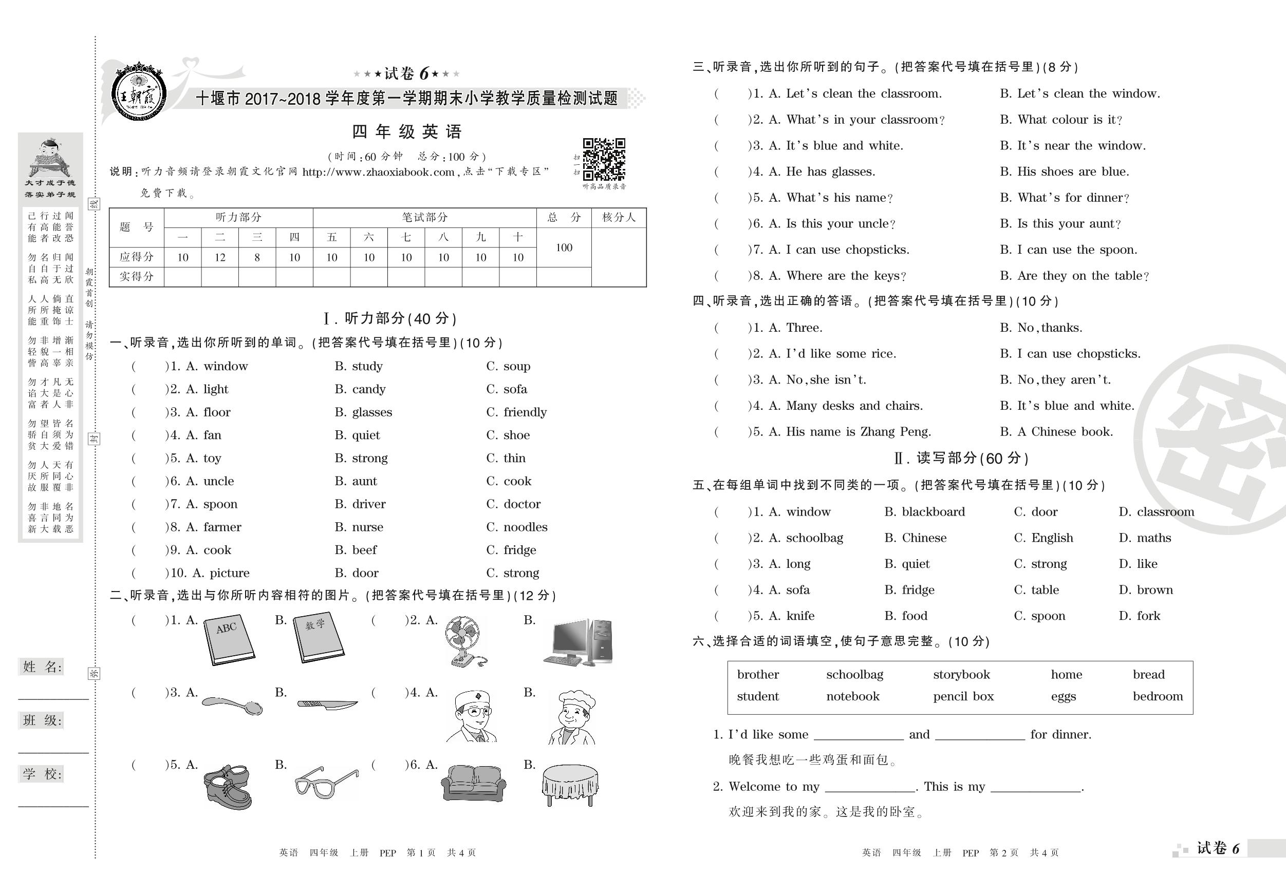2017-2018学年第一学期十堰市四年级英语试卷(PEP版)【6】