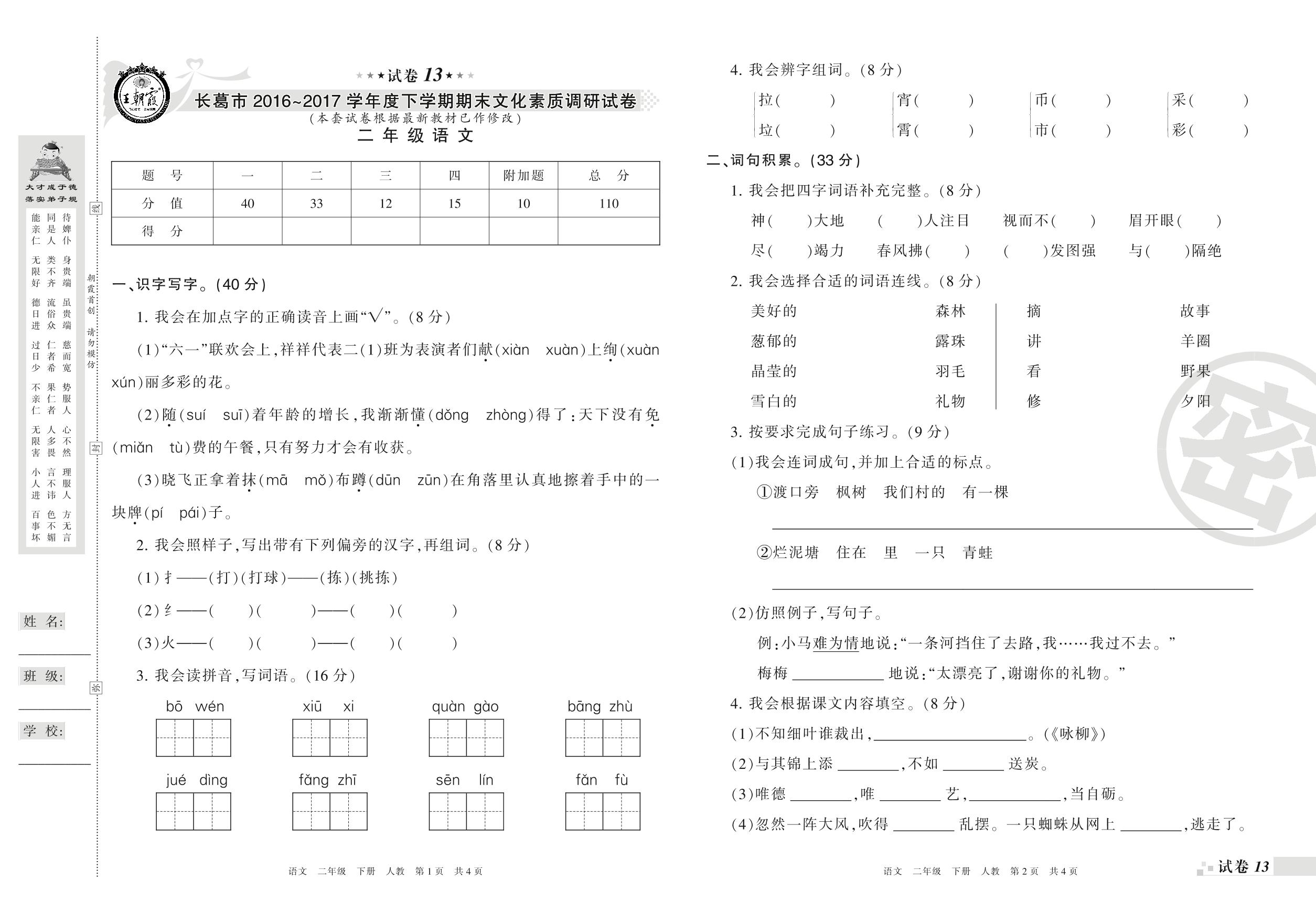 2016-2017学年第二学期长葛市二年级语文试卷(人教版)【13】