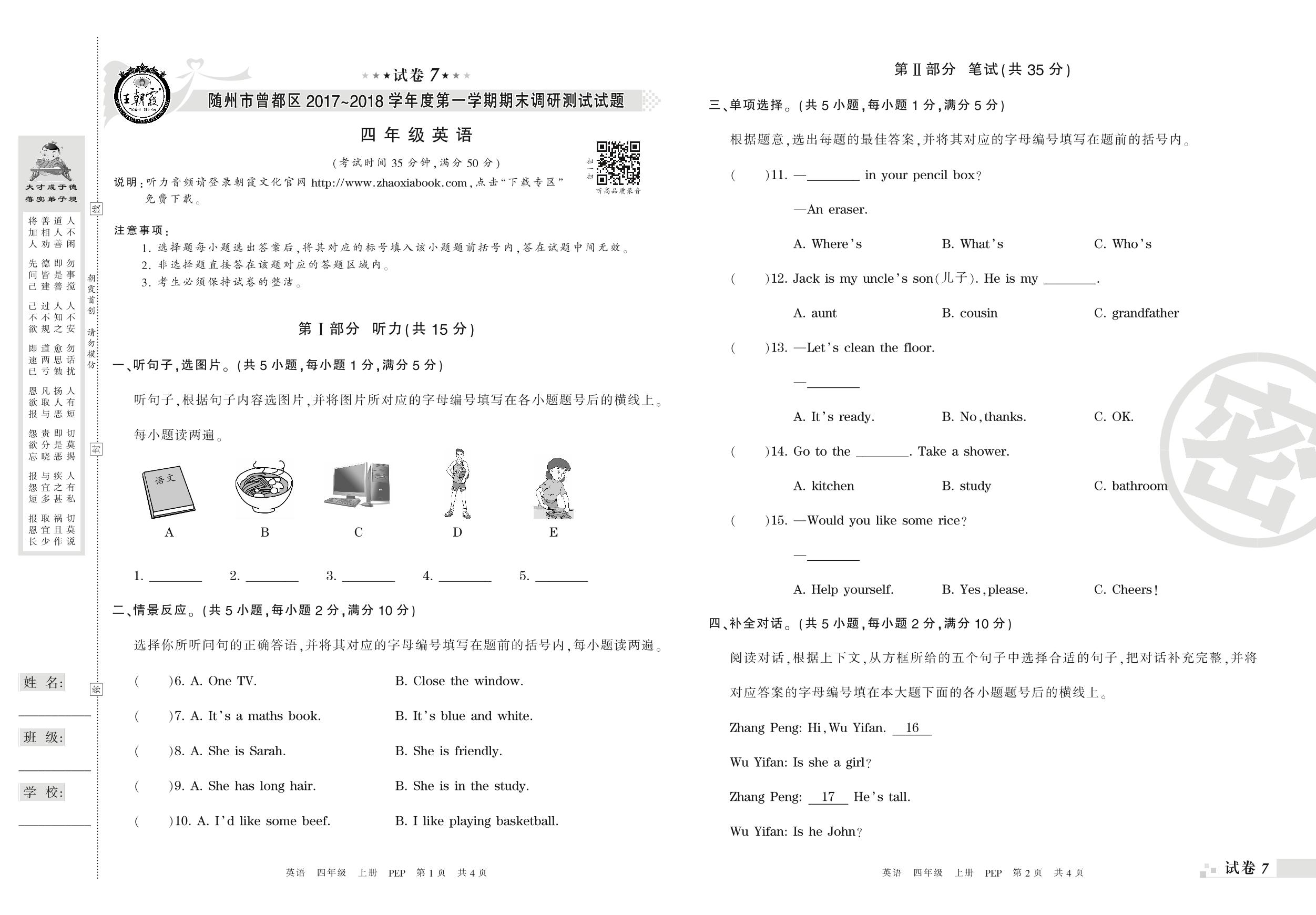 2017-2018学年第一学期随州市曾都区四年级英语试卷(PEP版)【7】