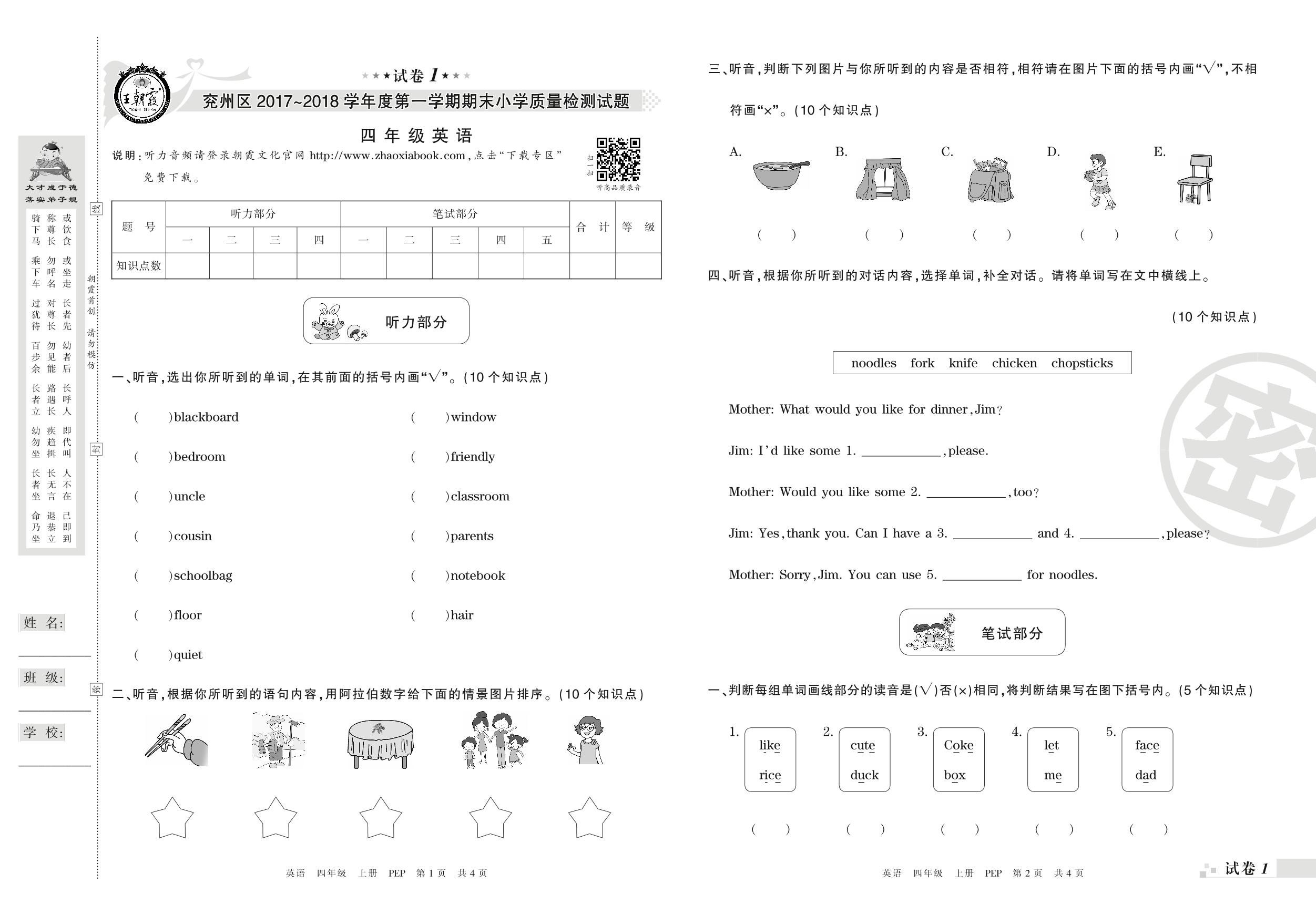 2017-2018学年第一学期济宁市兖州区四年级英语试卷(PEP版)【1】