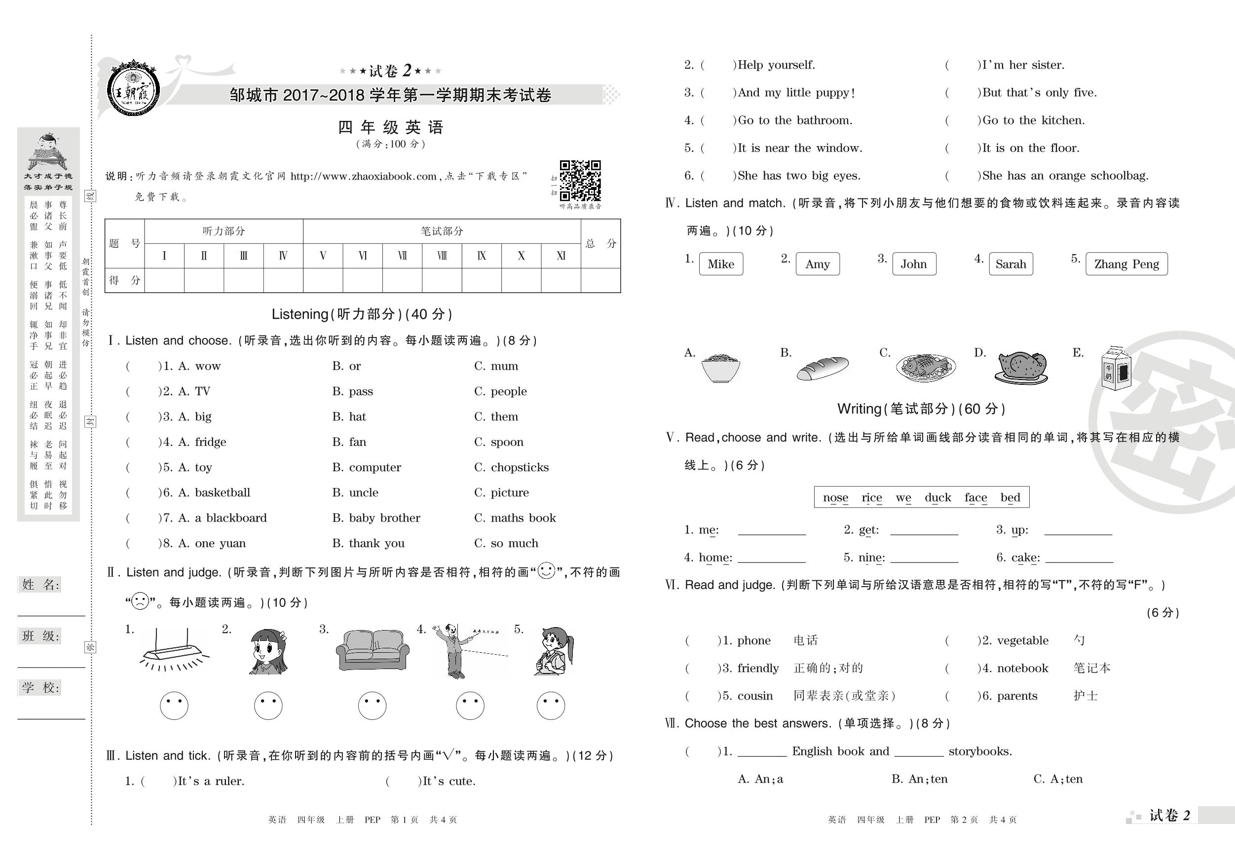 2017-2018学年第一学期邹城市四年级英语试卷(PEP版)【2】