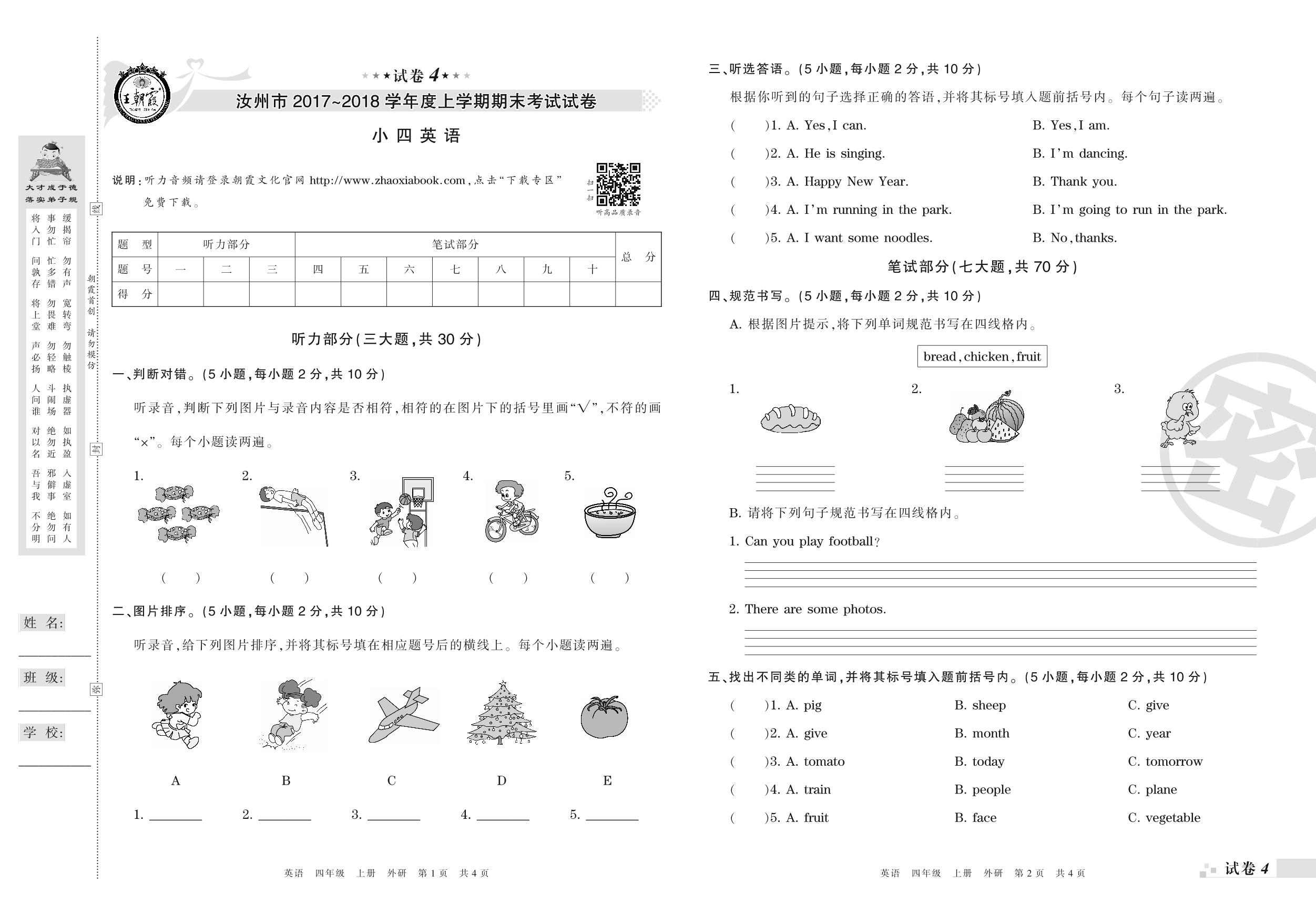 2017-2018学年第一学期汝州市四年级英语试卷(外研版)【4】