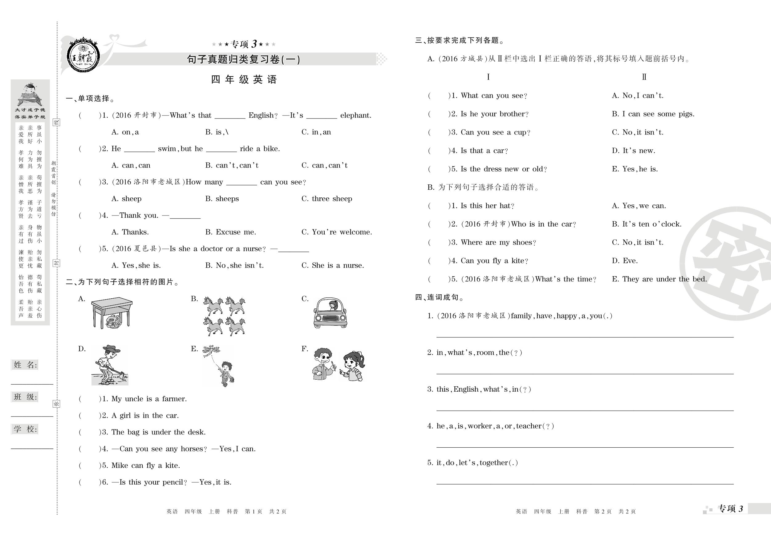 王朝霞期末专项卷——句子真题归类复习四年级上册英语(科普版)【0】