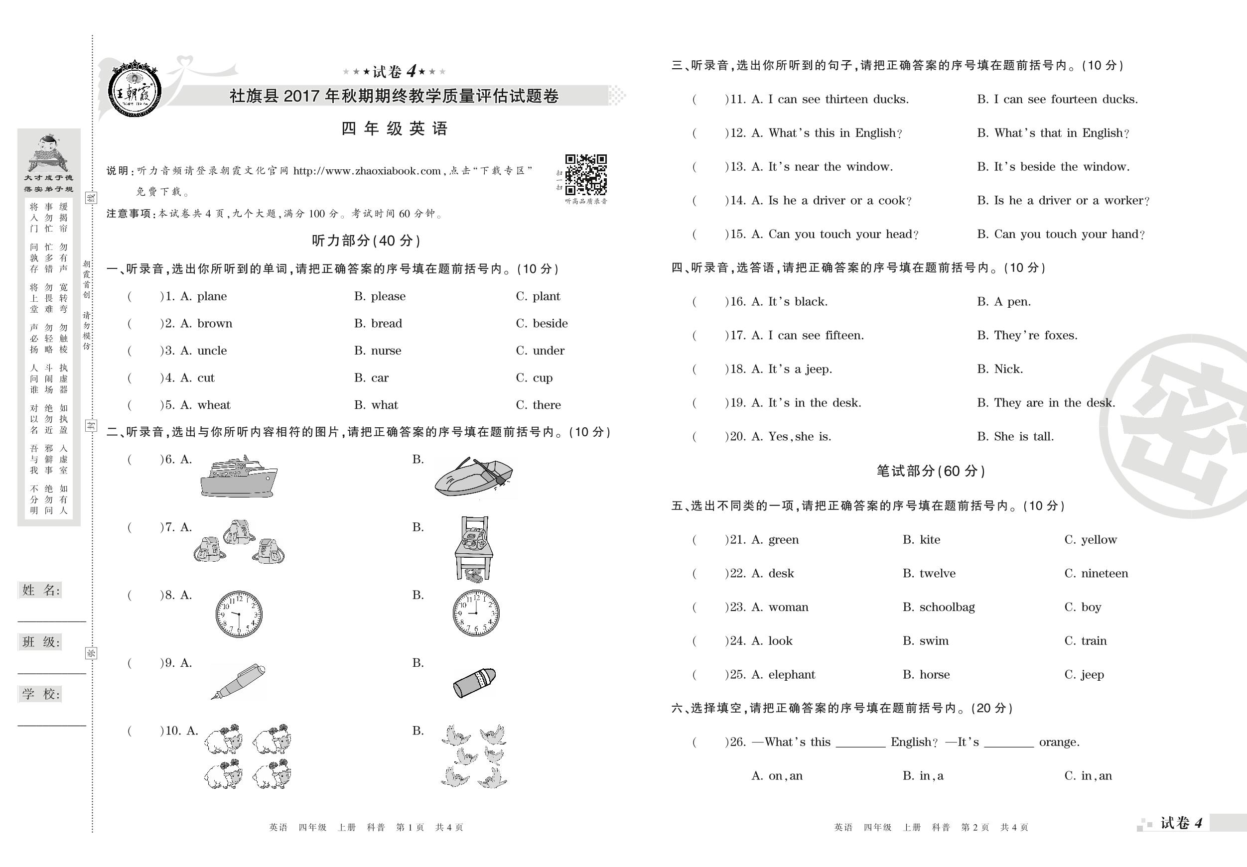 2017-2018学年第一学期南阳市社旗县四年级英语试卷(科普版)【4】