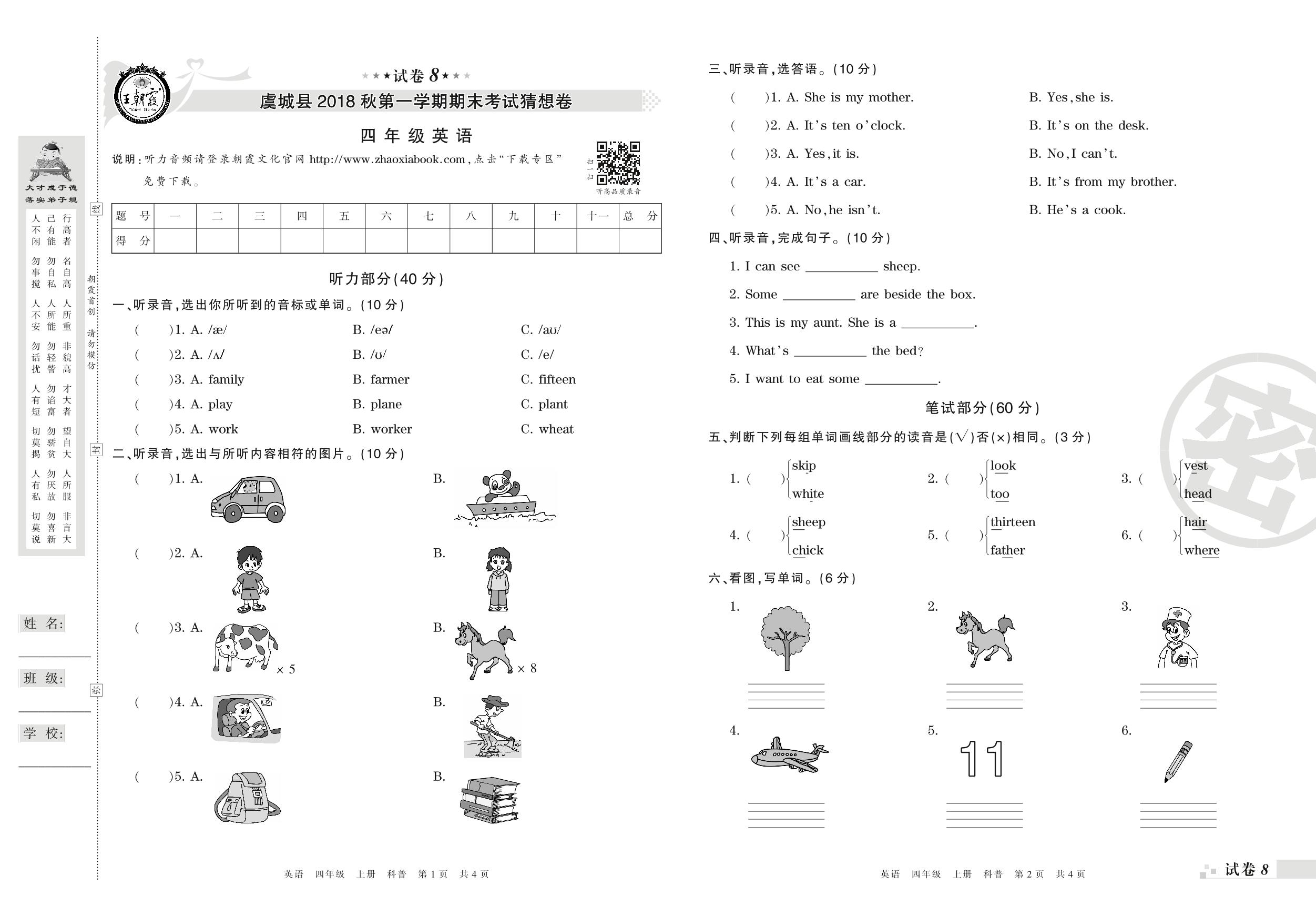 2017-2018学年第一学期商丘市虞城县四年级英语试卷(科普版)【8】