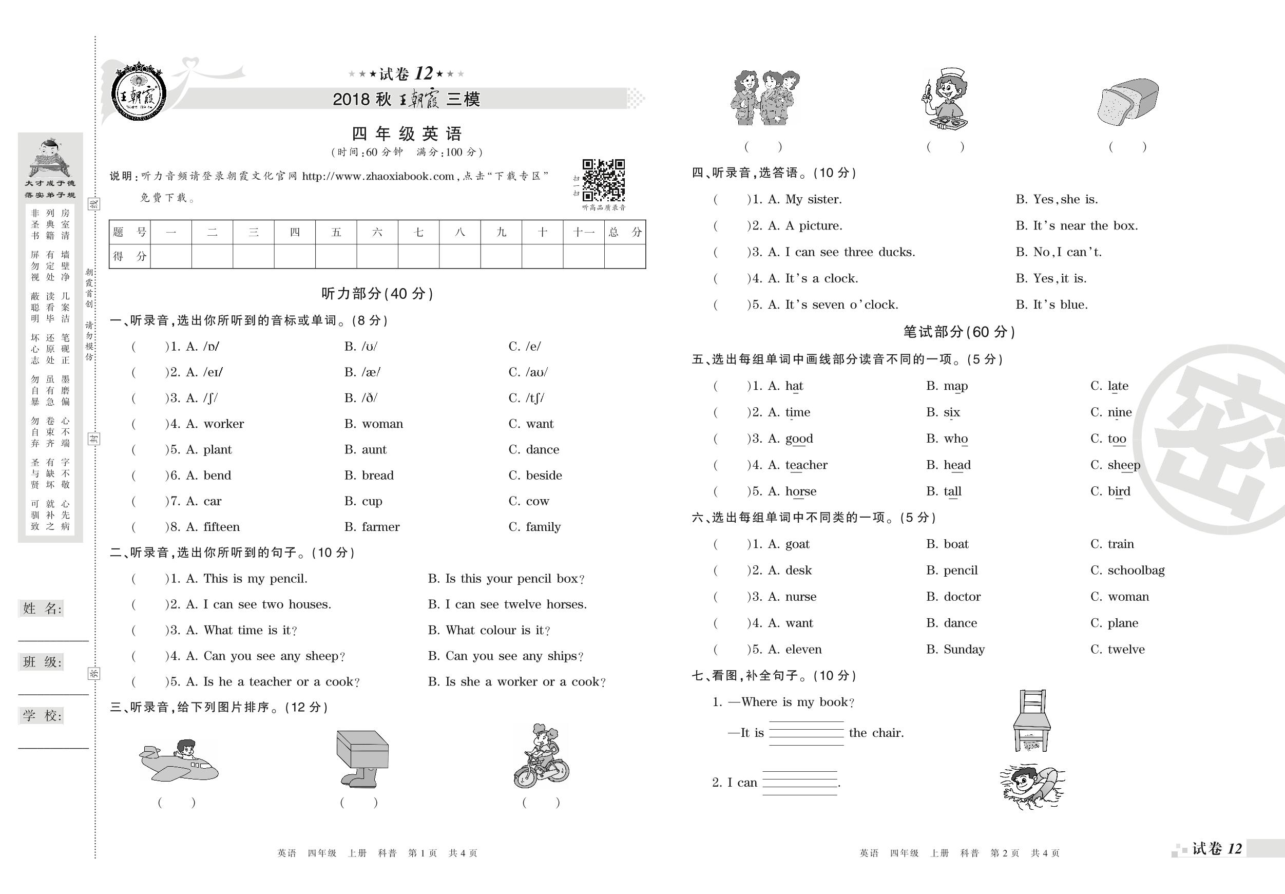 王朝霞期末模拟卷四年级上册英语(科普版)_R210807102046【12】