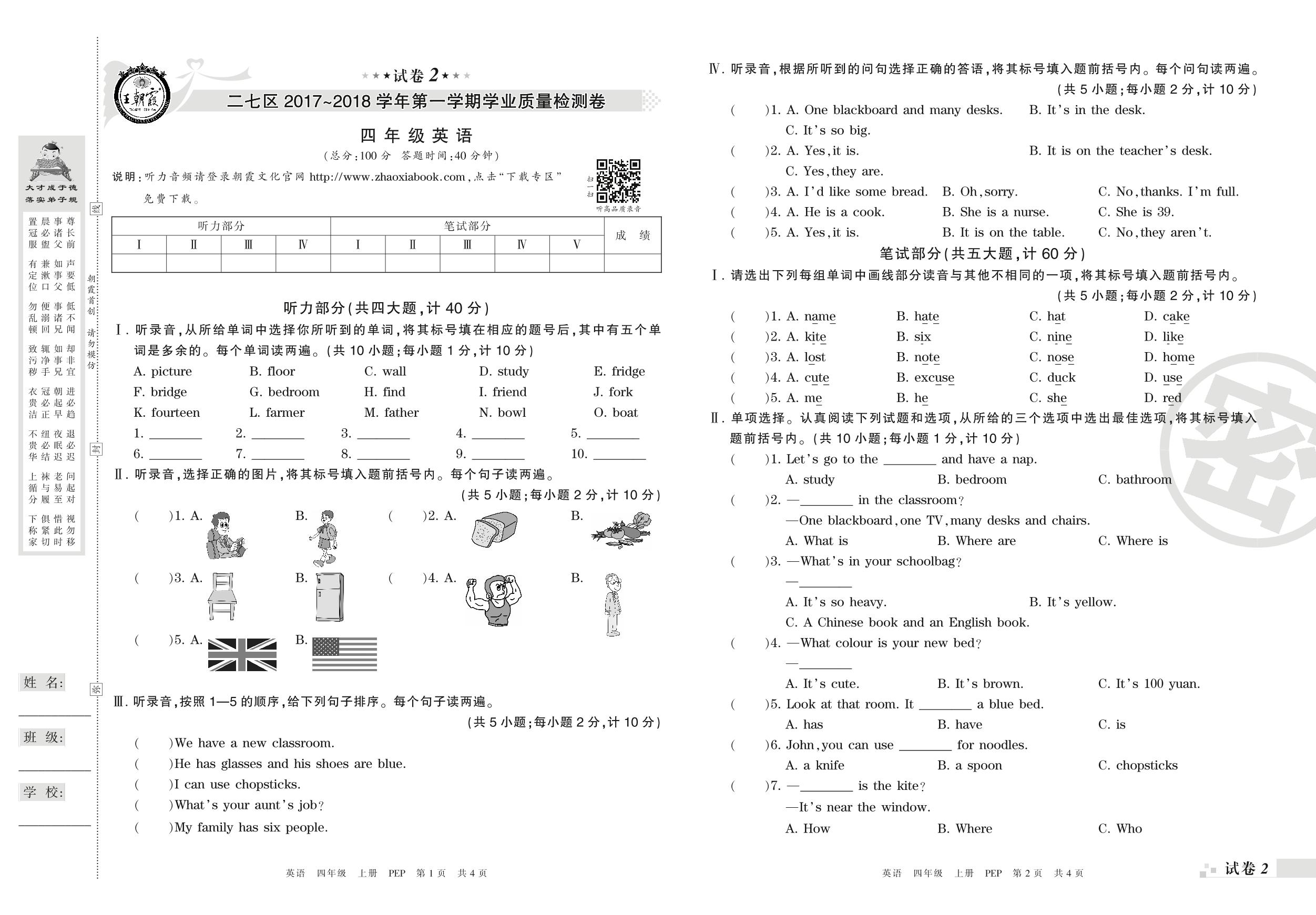 2017-2018学年第一学期郑州市二七区四年级英语试卷(PEP版)【2】