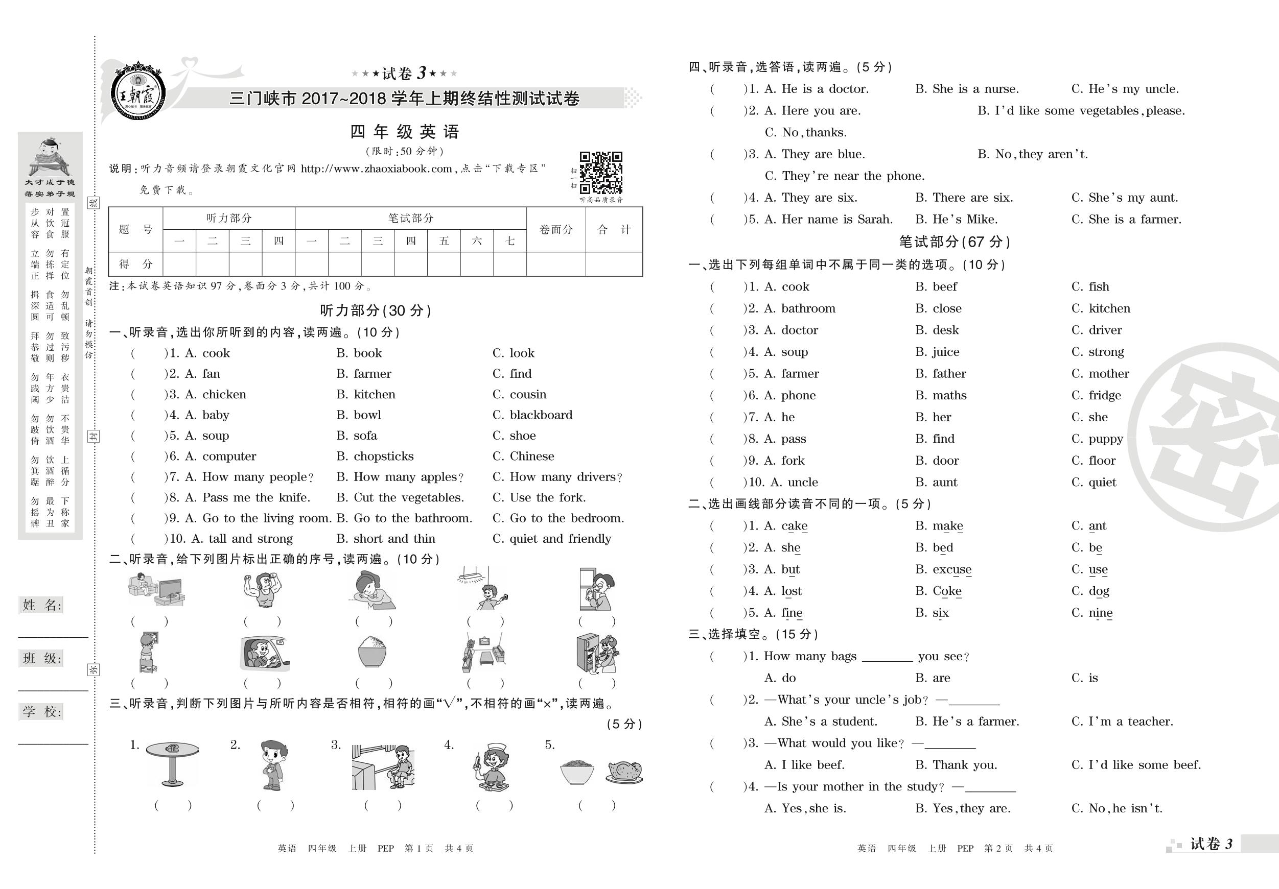 2017-2018学年第一学期三门峡市四年级英语试卷(PEP版)【3】