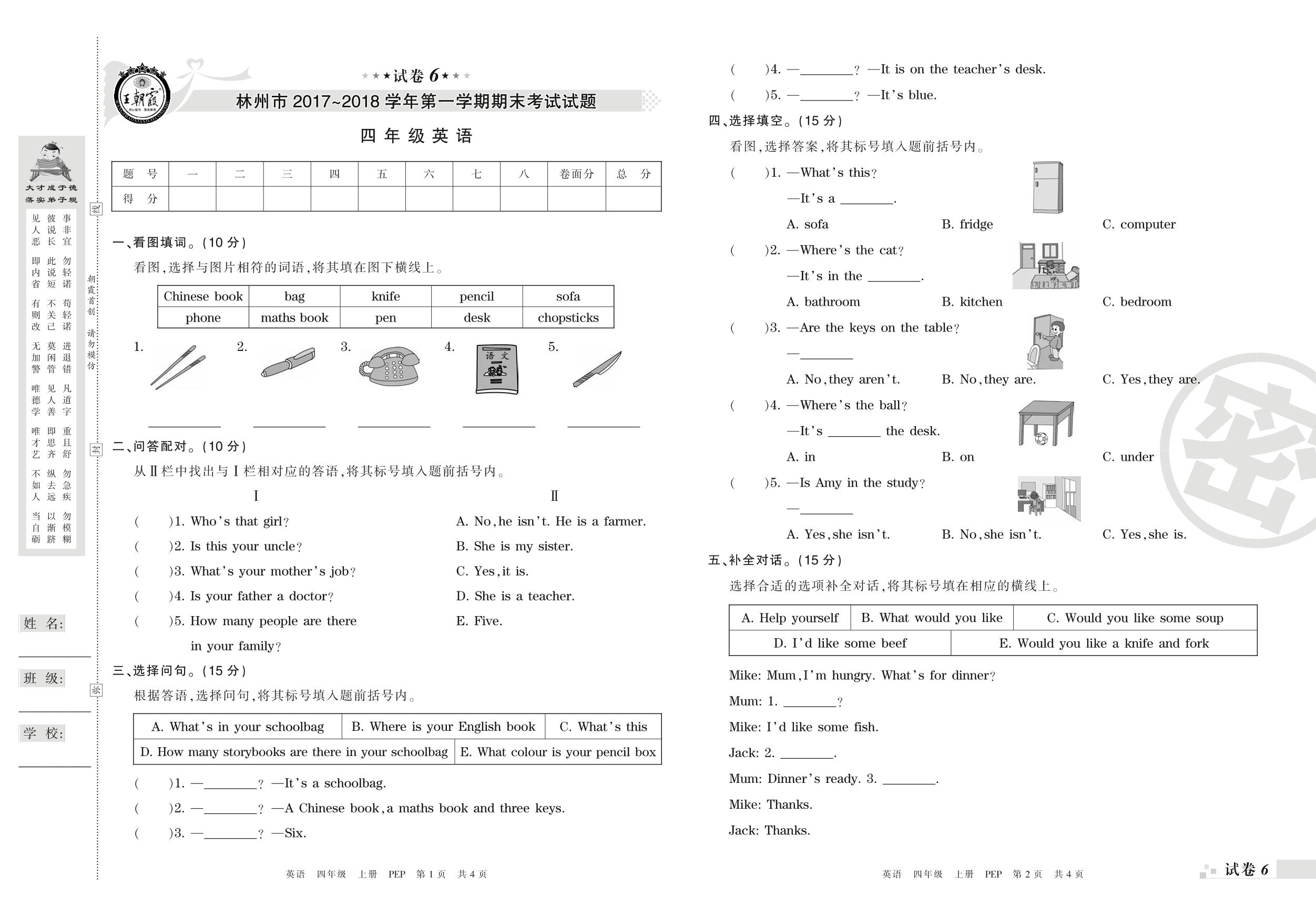 四年级英语人教PEP版(三起始)上册期末卷