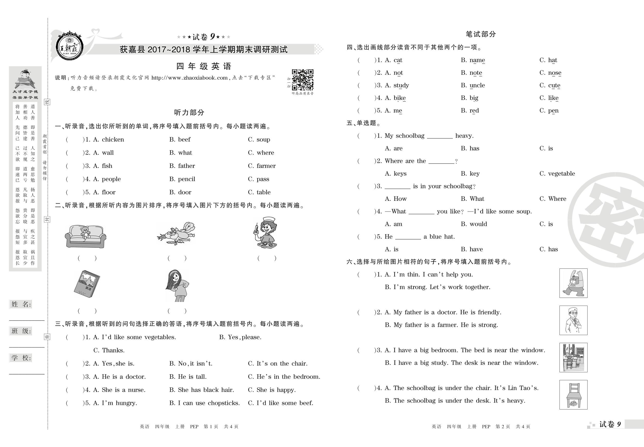 2017-2018学年第一学期新乡市获嘉县四年级英语试卷(PEP版)【9】