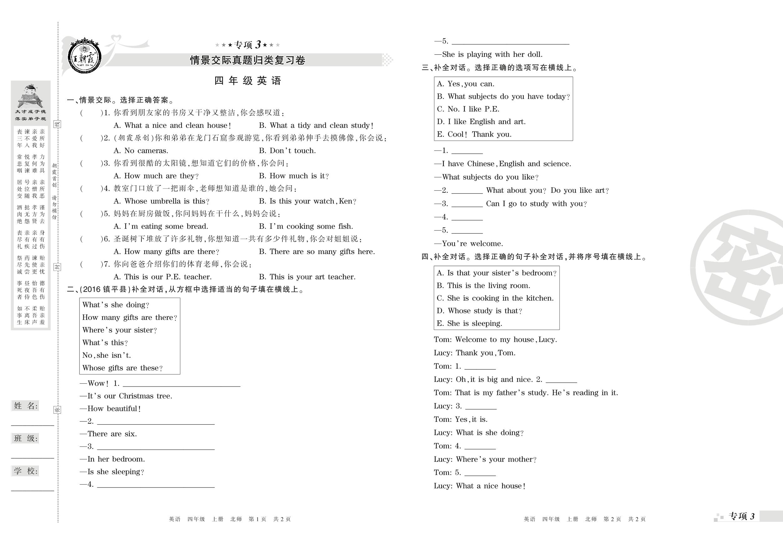 王朝霞期末专项卷——情景交际、阅读理解真题归类复习四年级上册英语(北师版)_R210807102220【0】