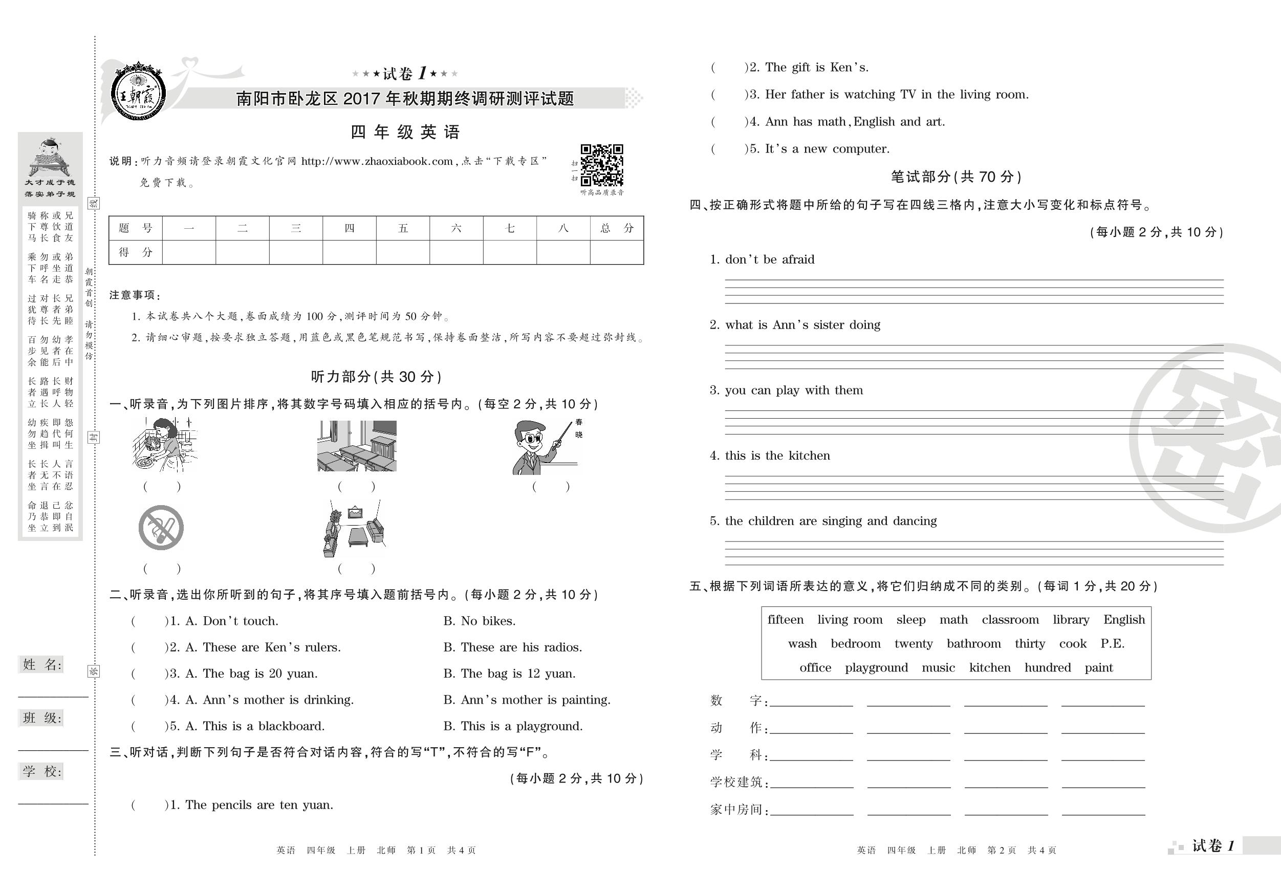 2017-2018学年第一学期南阳市卧龙区四年级英语试卷(北师版)【1】