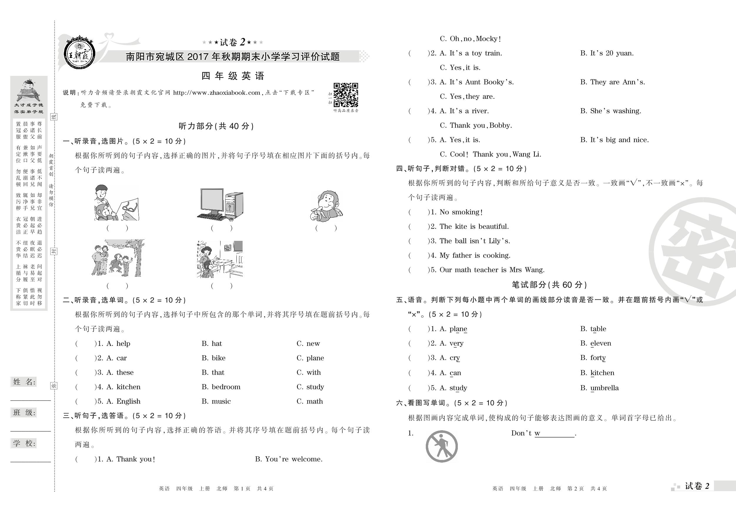 2017-2018学年第一学期南阳市宛城区四年级英语试卷(北师版)【2】