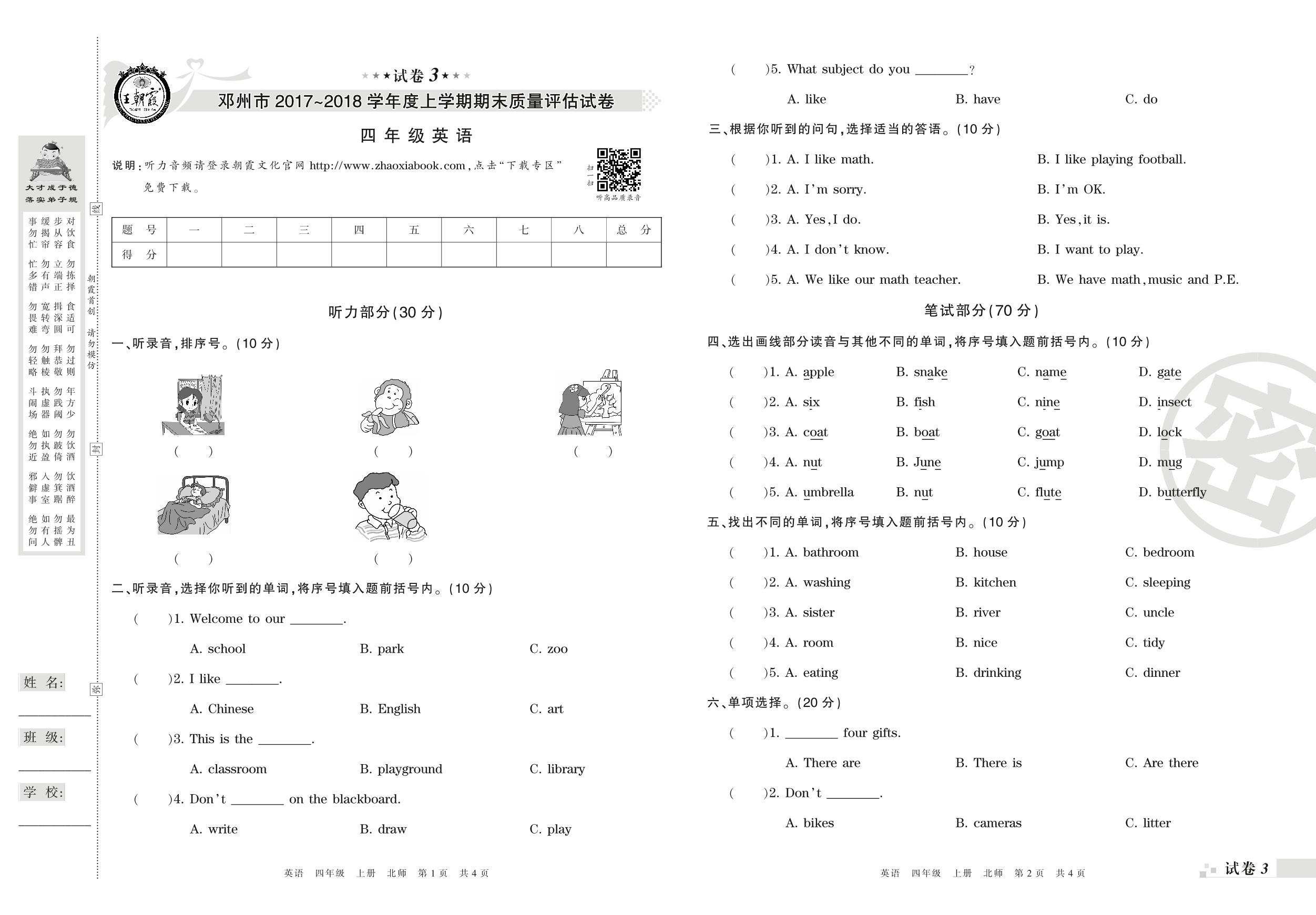 2017-2018学年第一学期邓州市四年级英语试卷(北师版)【3】