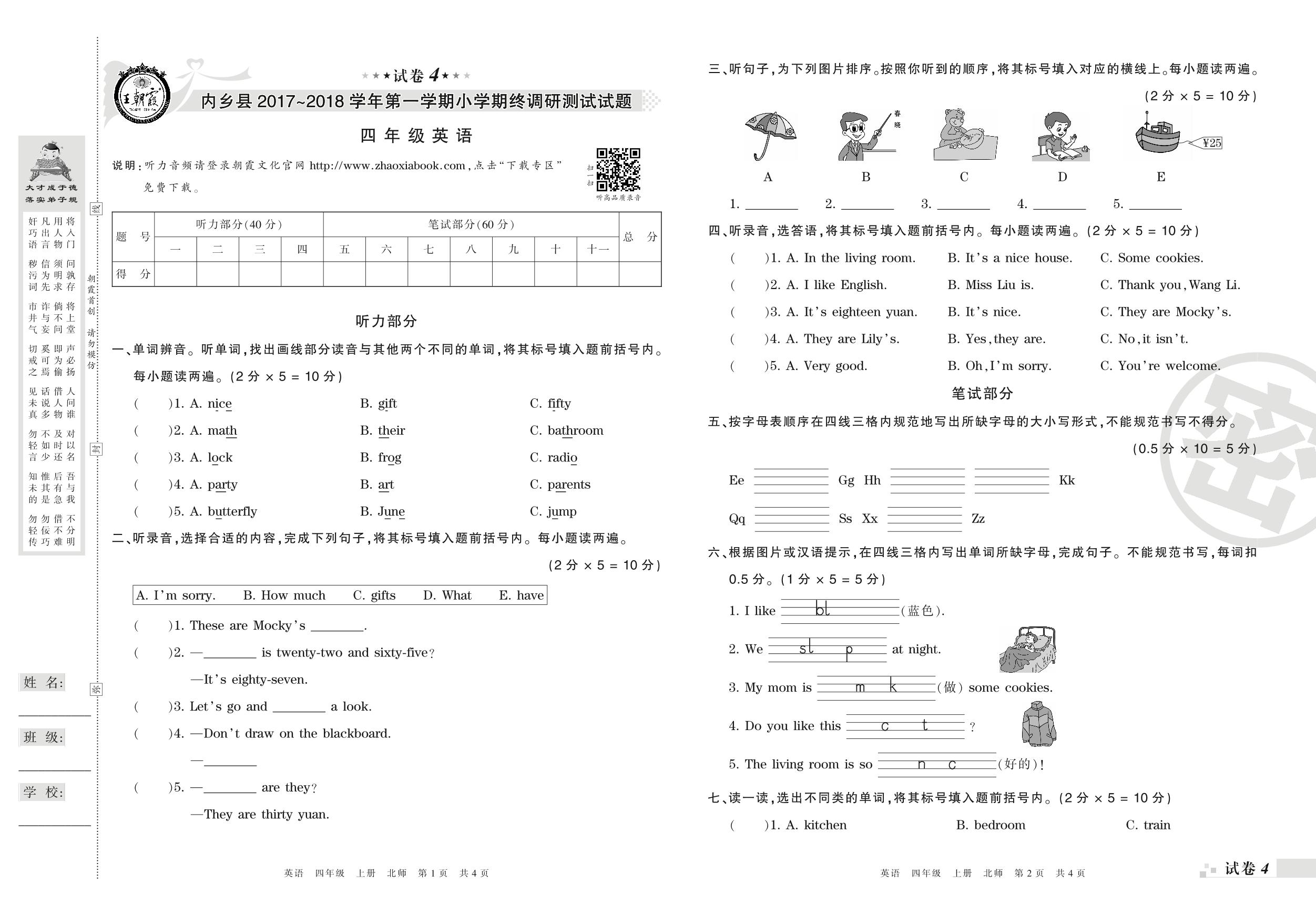 2017-2018学年第一学期南阳市内乡县四年级英语试卷(北师版)【4】