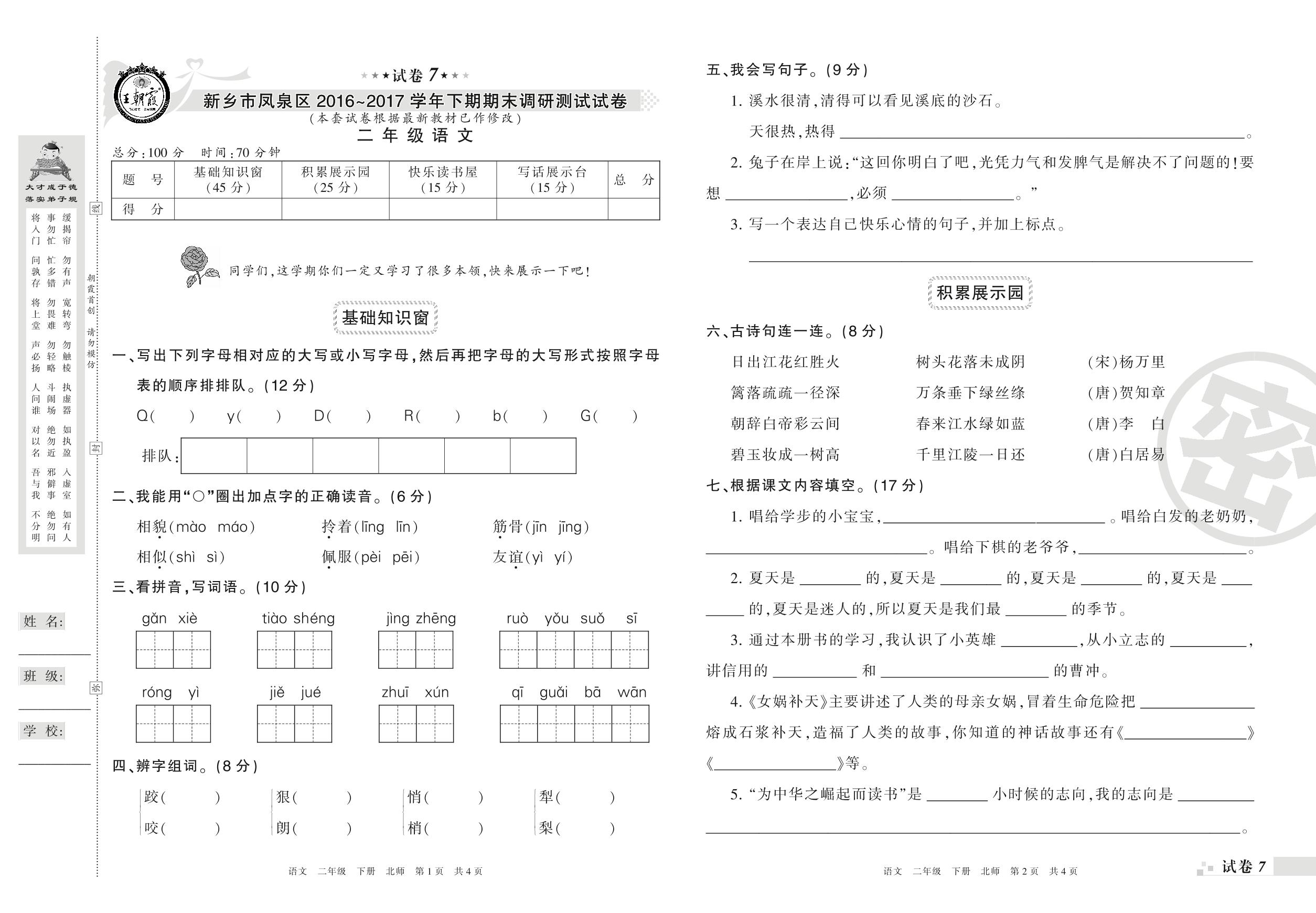 2016-2017学年第二学期新乡市凤泉区二年级语文试卷(北师版)【7】