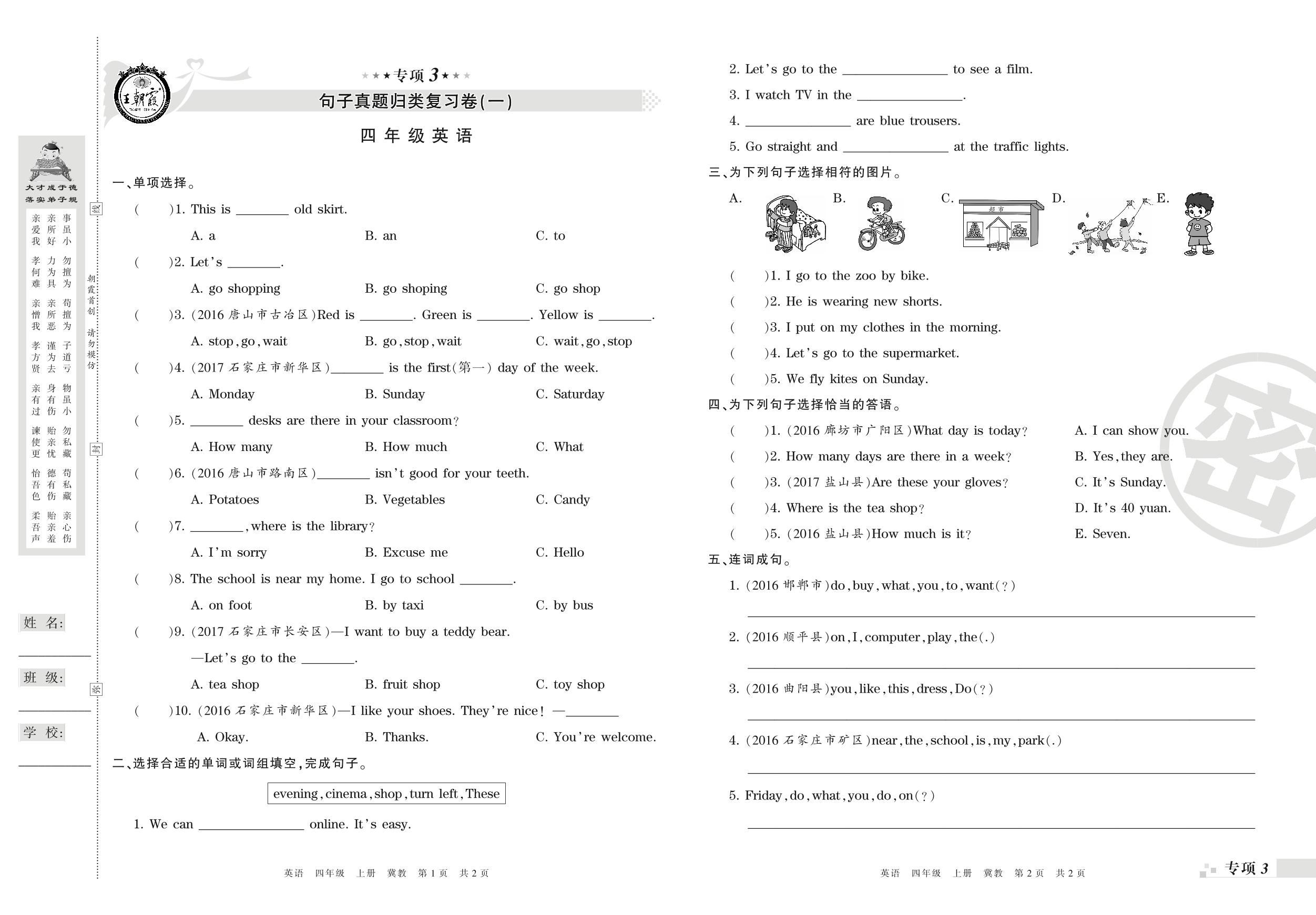 四年级英语冀教版上册专项卷