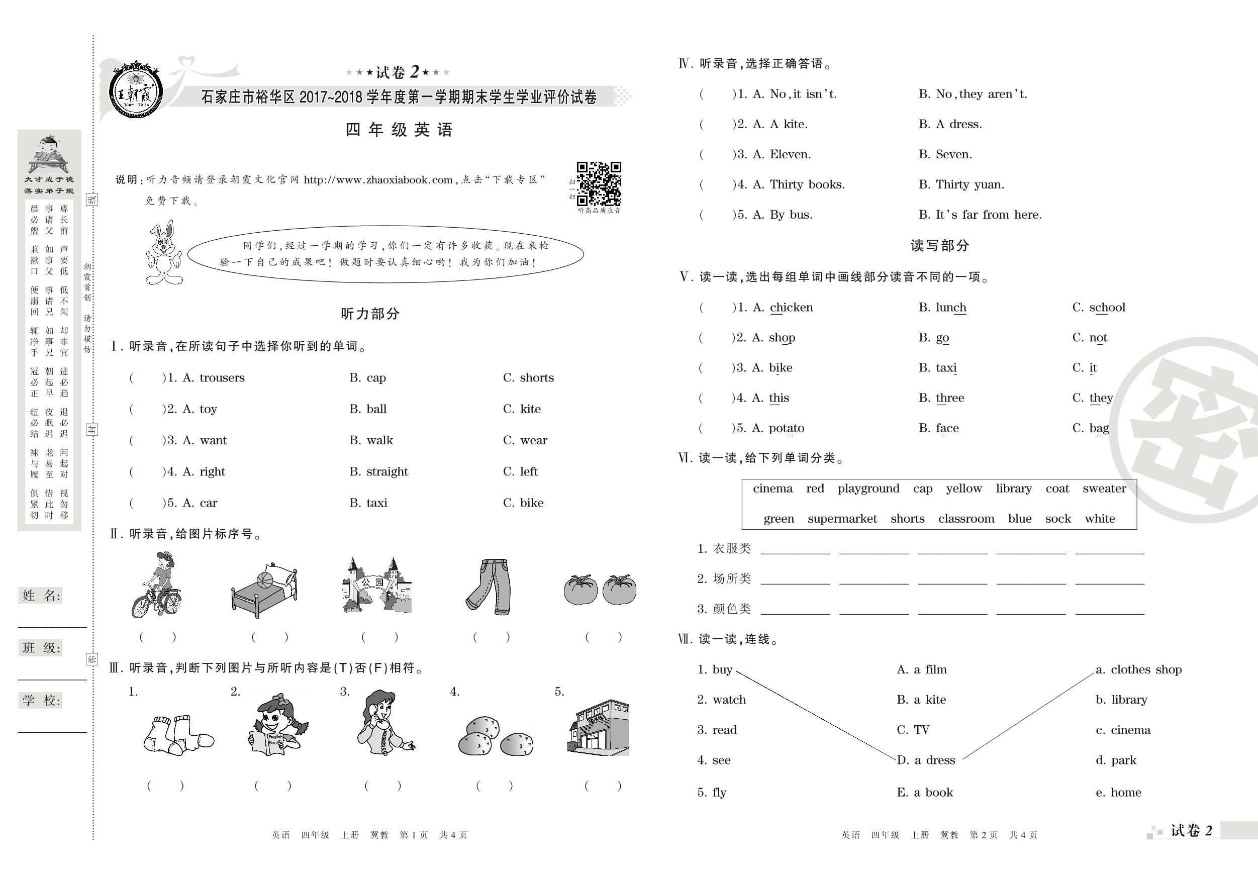2017-2018学年第一学期石家庄市裕华区四年级英语试卷(冀教版)【2】