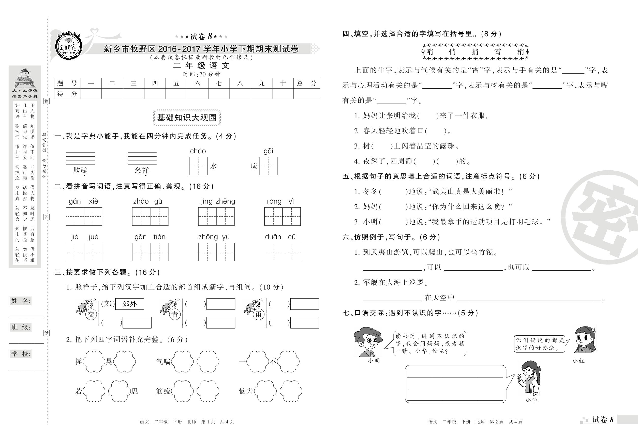 2016-2017学年第二学期新乡市牧野区二年级语文试卷(北师版)【8】