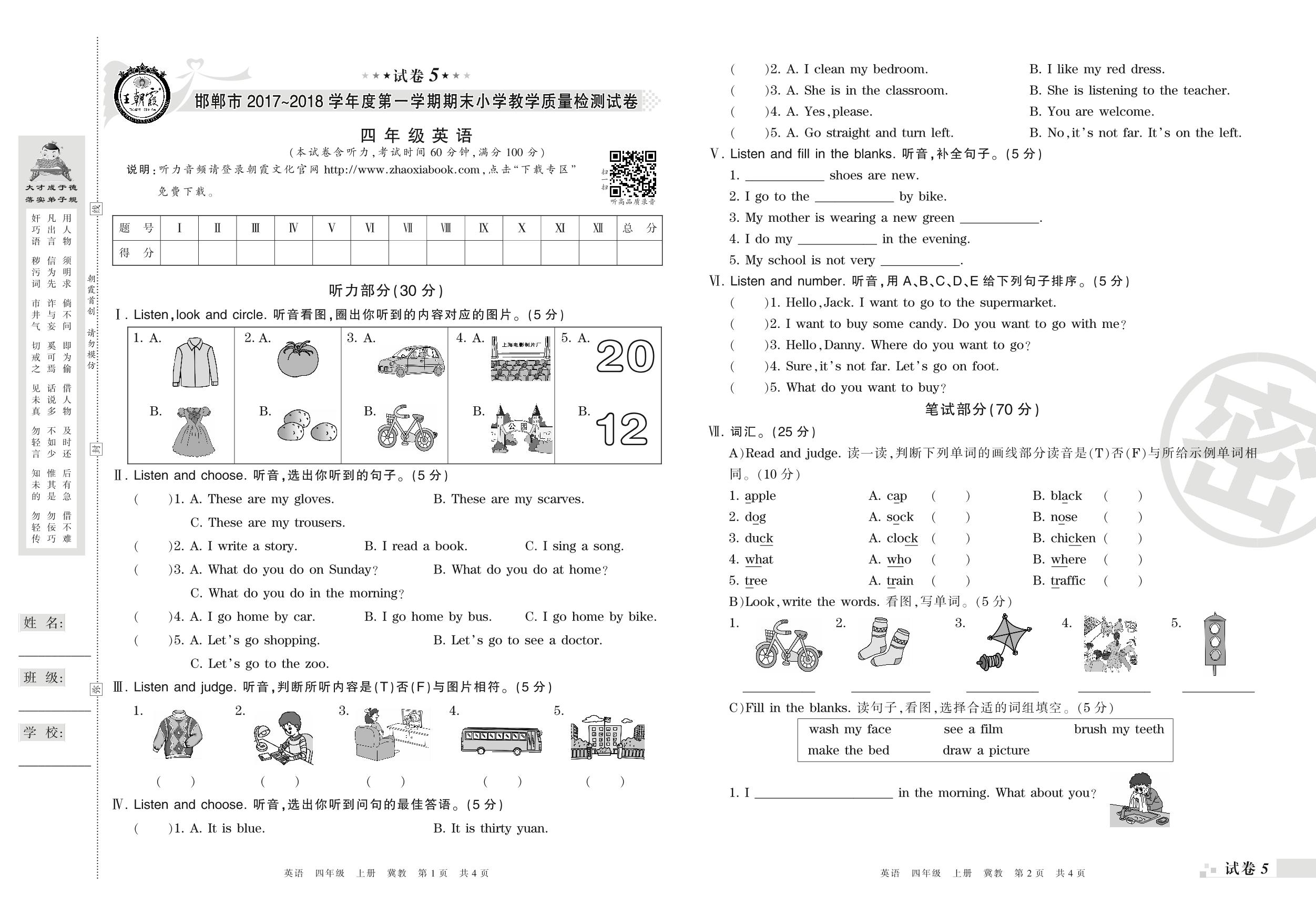 2017-2018学年第一学期邯郸市四年级英语试卷(冀教版)【5】
