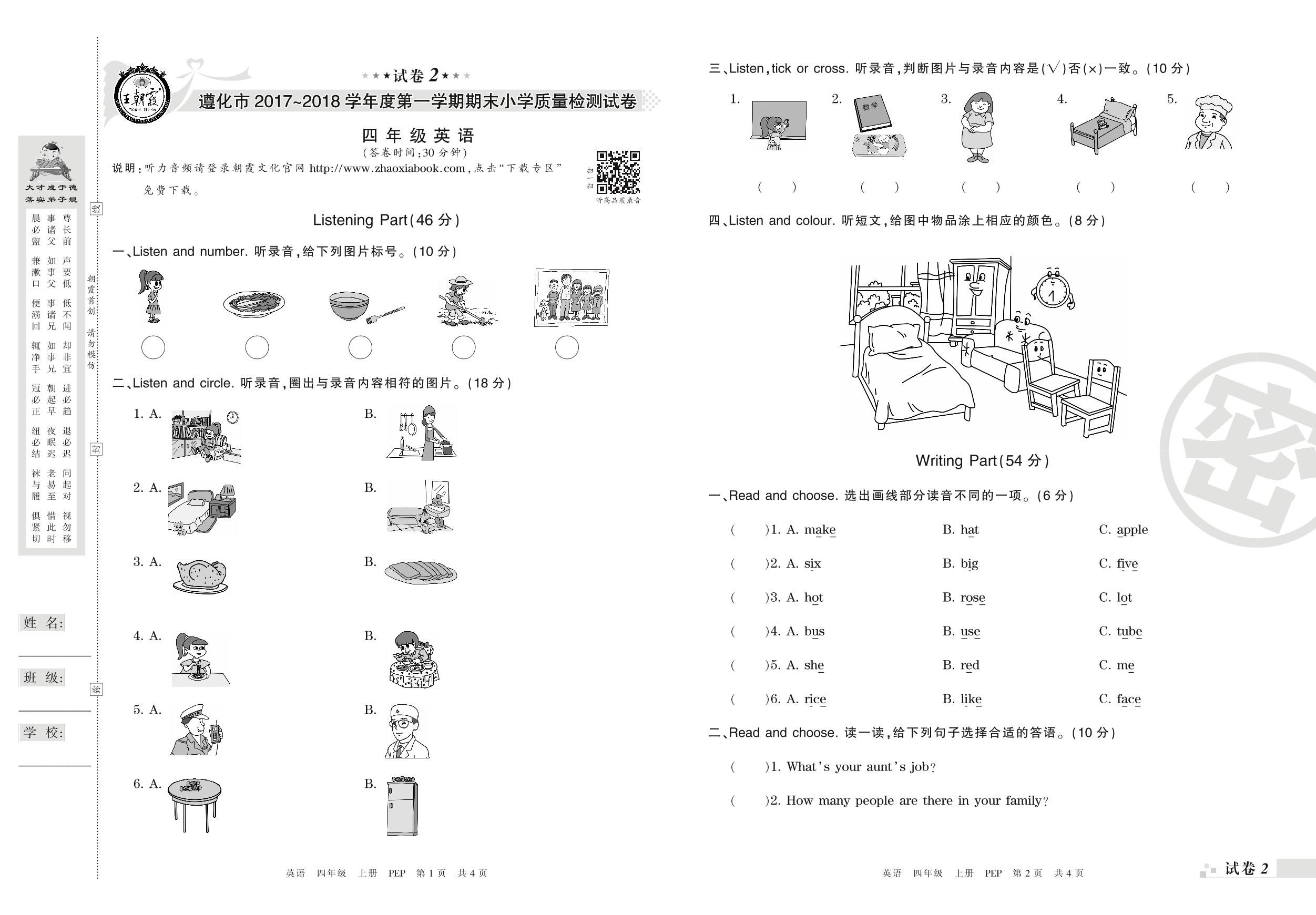 2017-2018学年第一学期遵化市四年级英语试卷(PEP版)【2】
