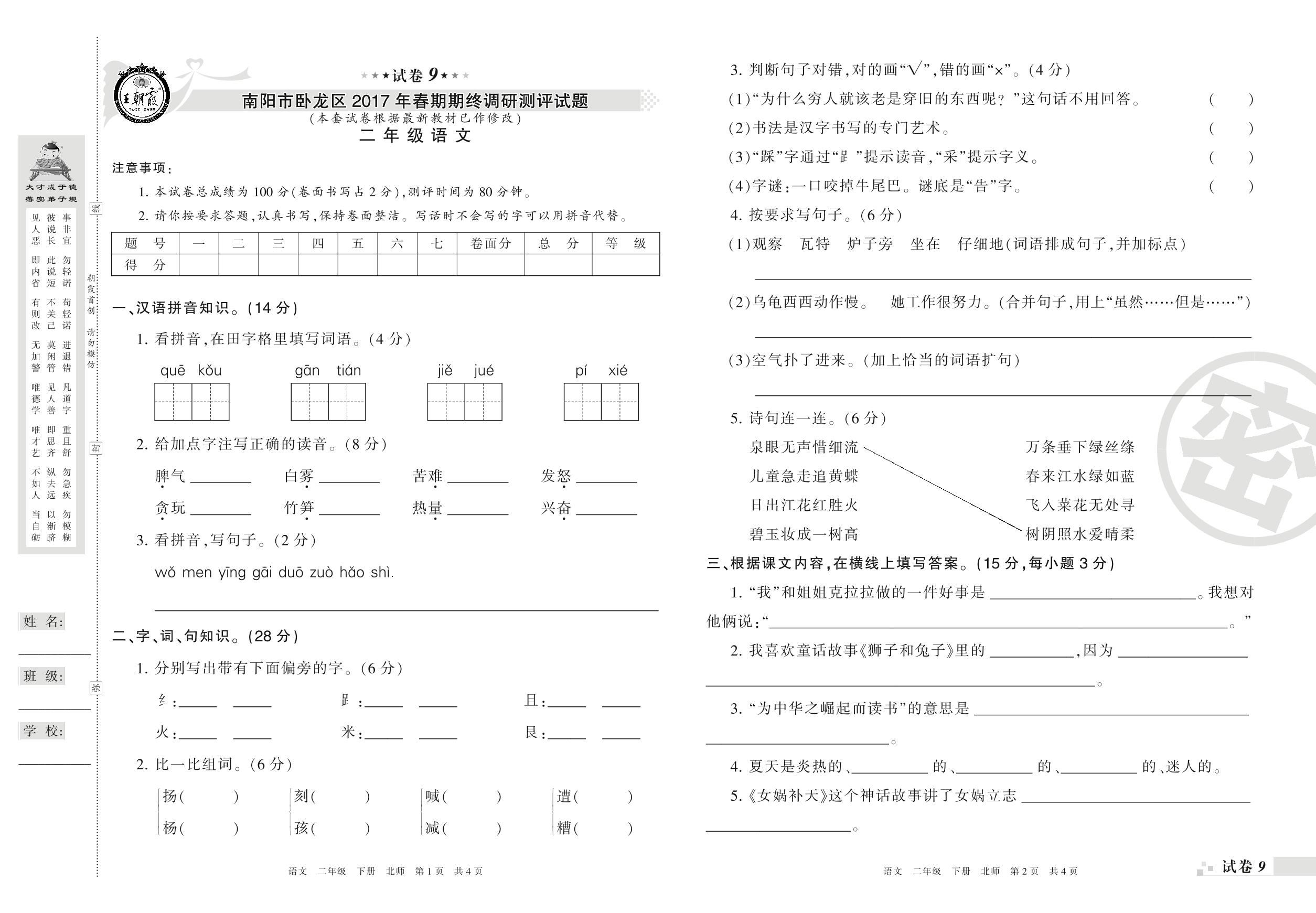 2016-2017学年第二学期南阳市卧龙区二年级语文试卷(北师版)【9】
