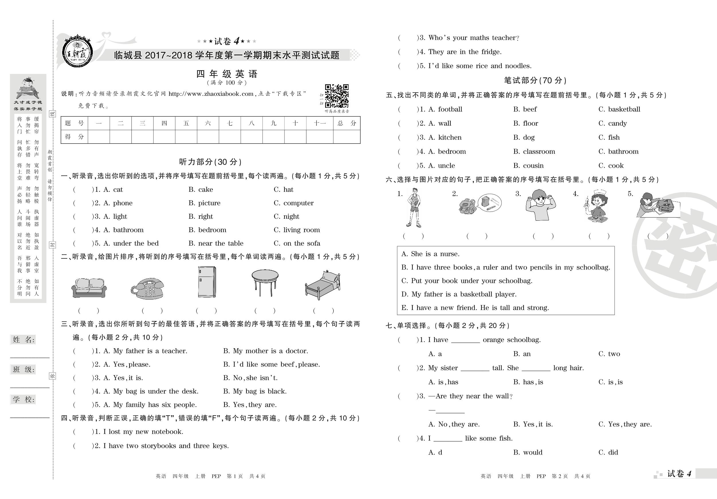 2017-2018学年第一学期邢台市临城县四年级英语试卷(PEP版)【4】