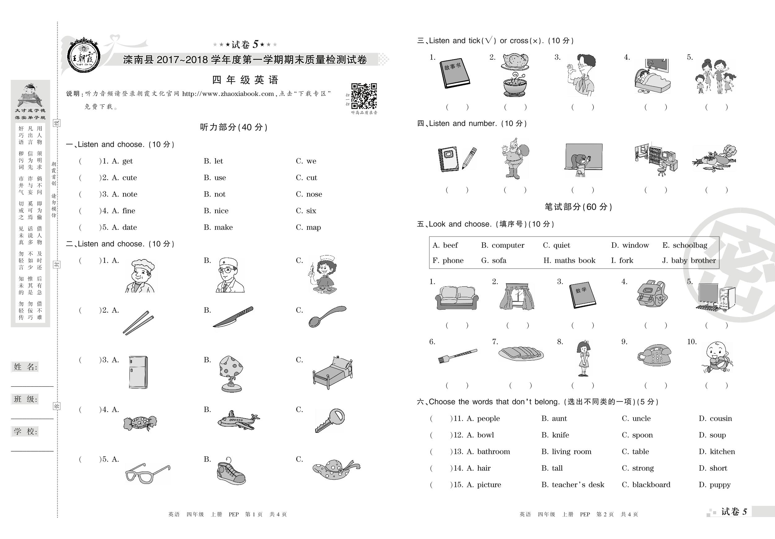 2017-2018学年第一学期唐山市滦南县四年级英语试卷(PEP版)【5】