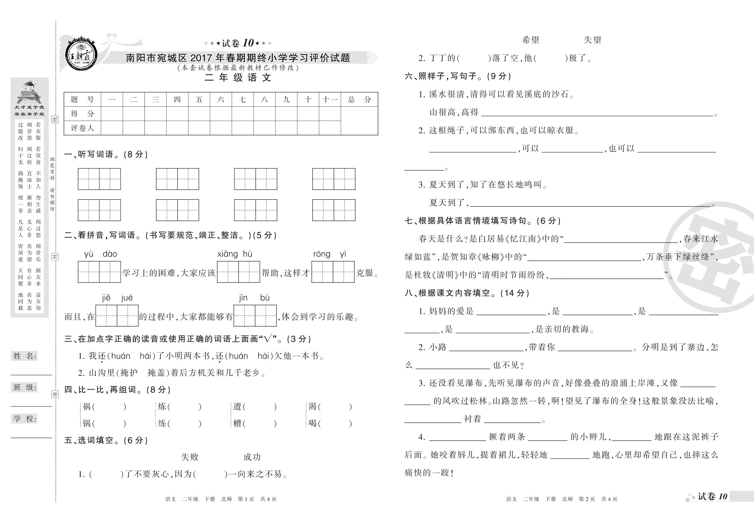 2016-2017学年第二学期南阳市宛城区二年级语文试卷(北师版)【10】