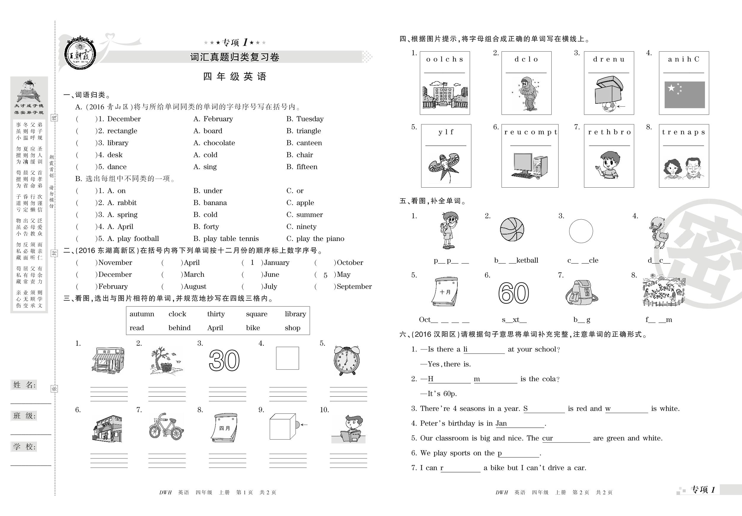 王朝霞期末专项卷——词汇、句子真题归类复习四年级上册英语(剑桥版)【0】