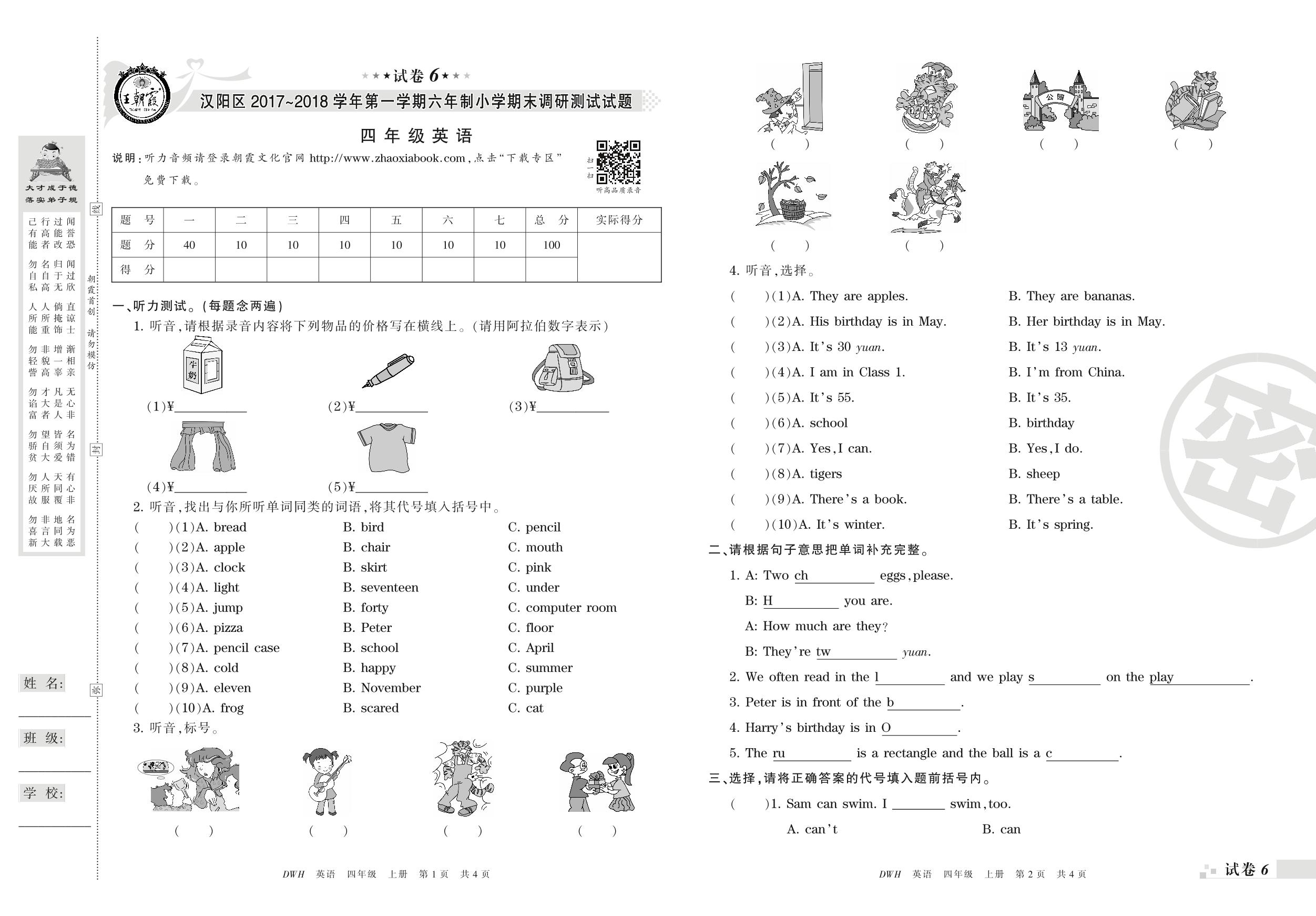2017-2018学年第一学期武汉市汉阳区四年级英语试卷(剑桥版)【6】