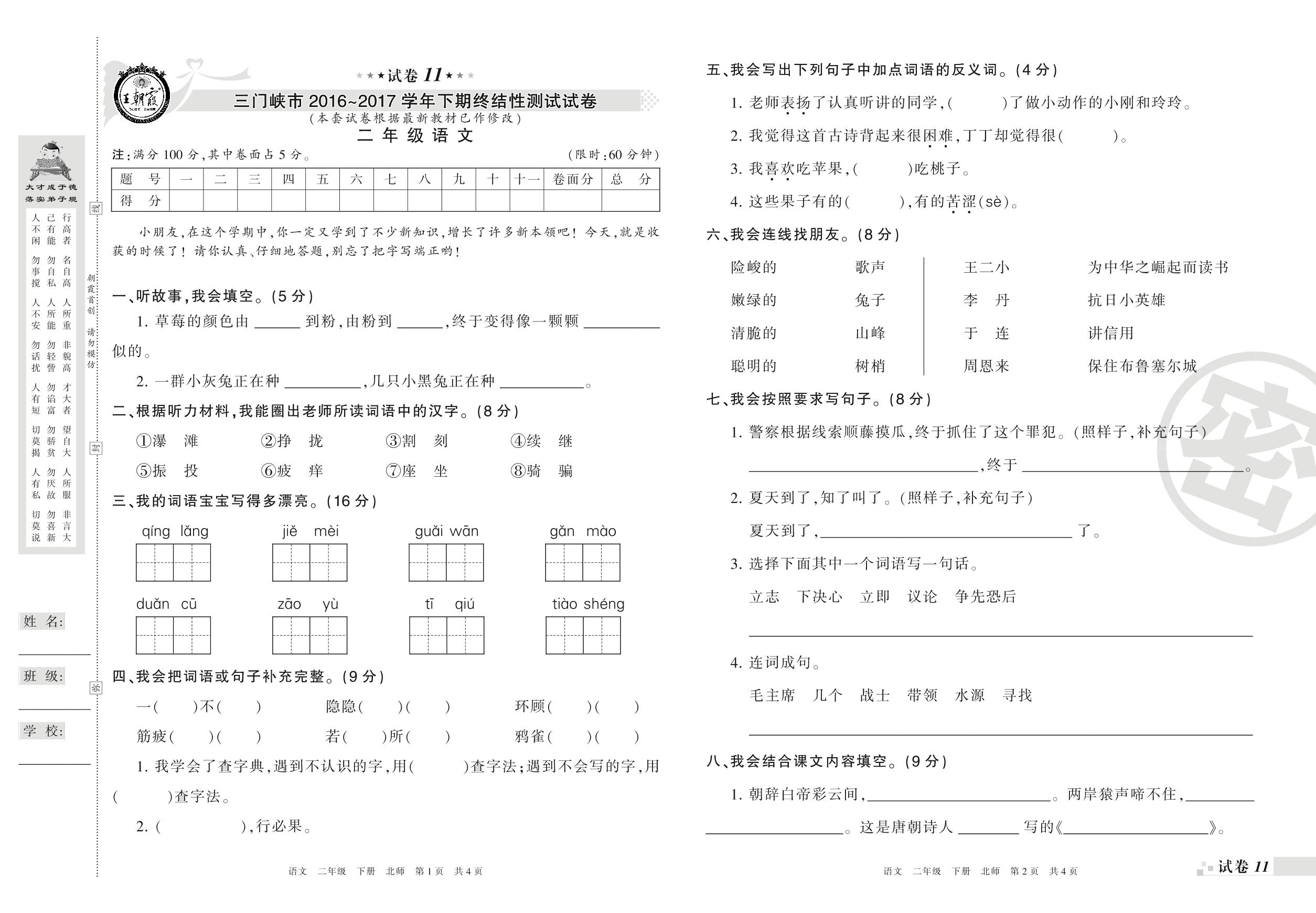 2016-2017学年第二学期三门峡市二年级语文试卷(北师版)【11】