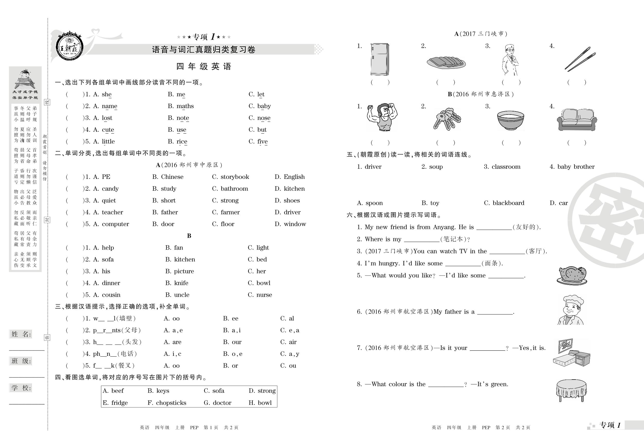 王朝霞期末专项卷——语音与词汇、句子真题归类复习四年级上册英语(PEP版)_R210807102606【0】