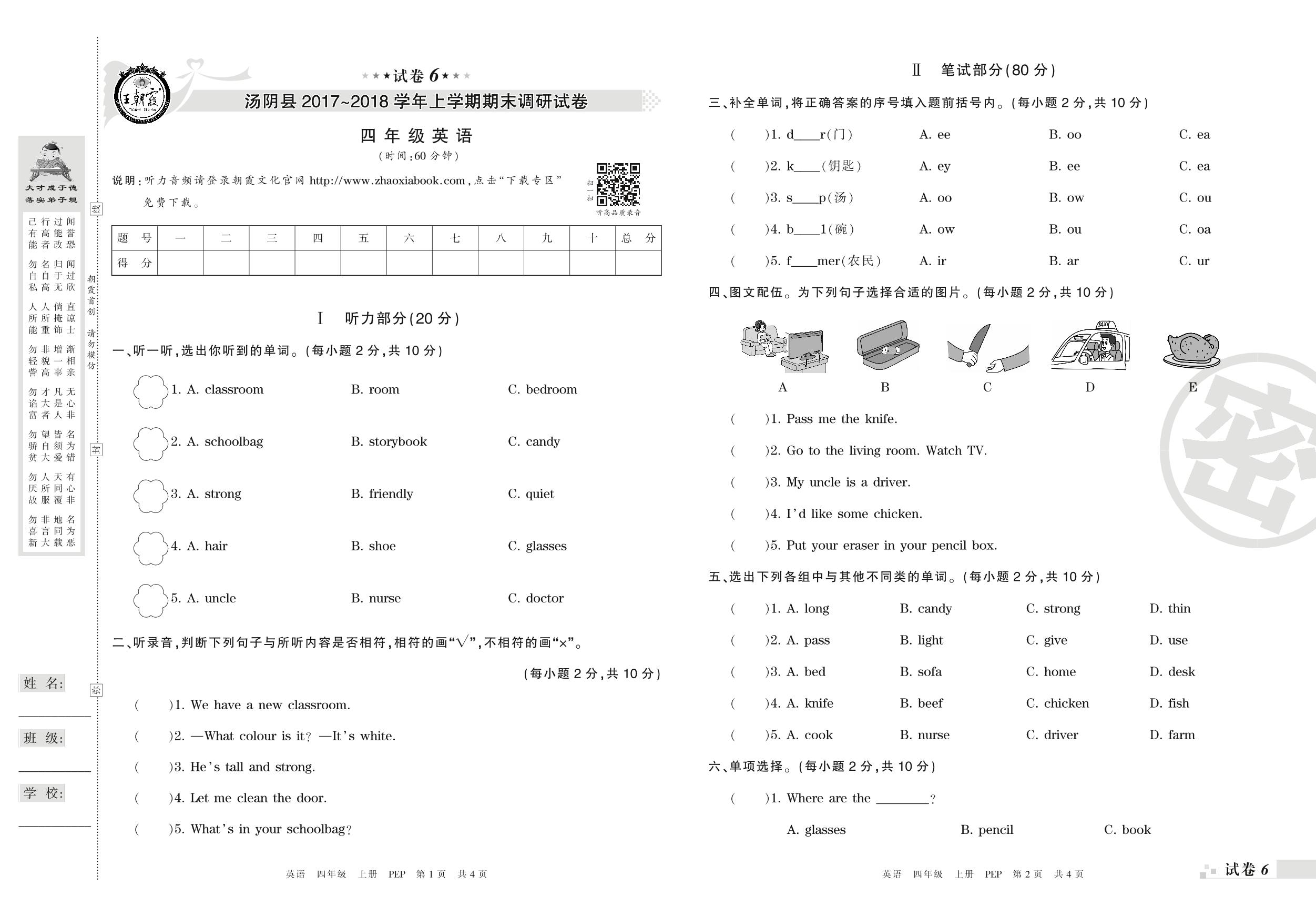 2017-2018学年第一学期安阳市汤阴县四年级英语试卷(PEP版)【6】